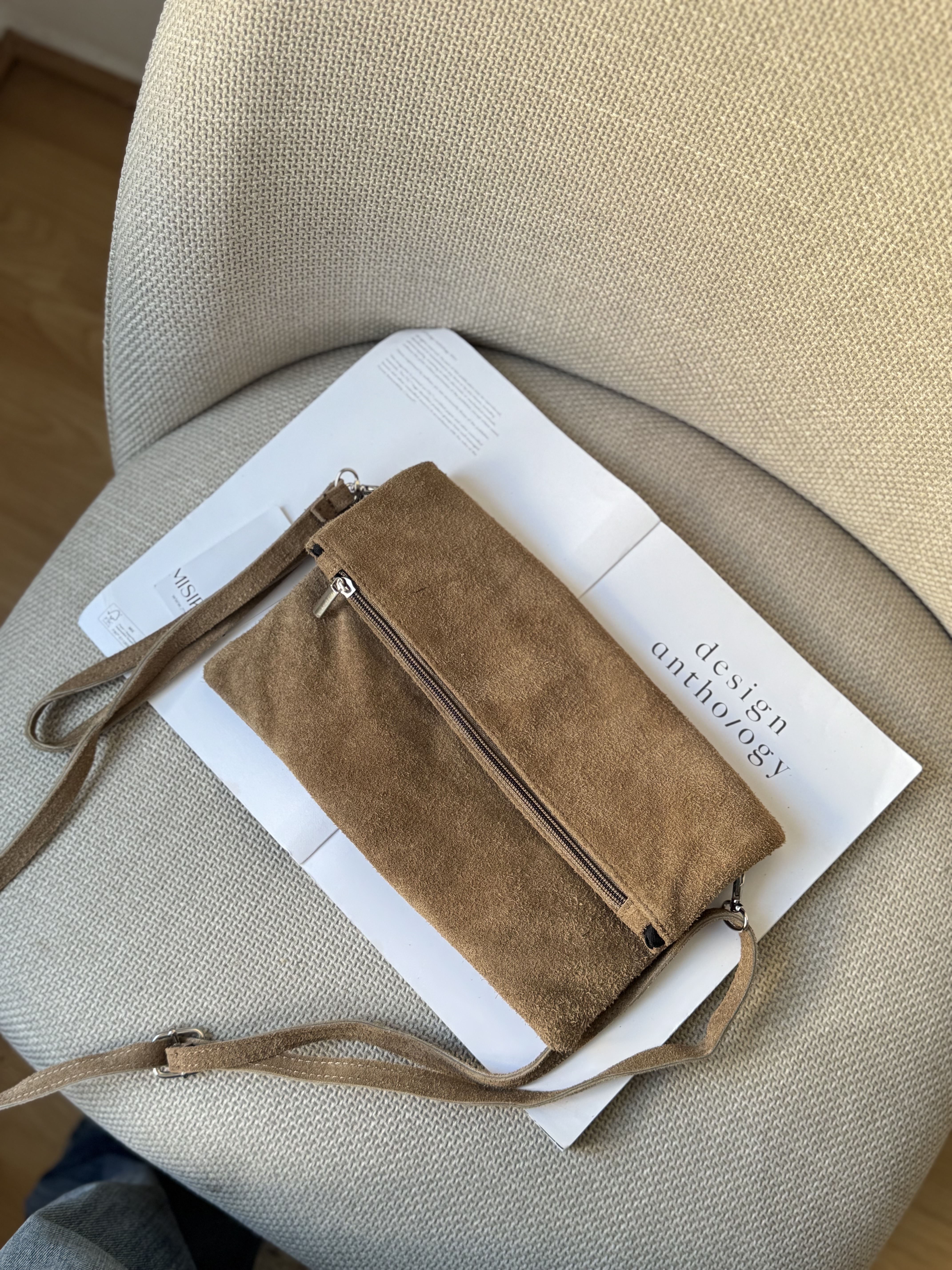 Suede τσάντα χειρός με λουρί σε χρώμα taupe