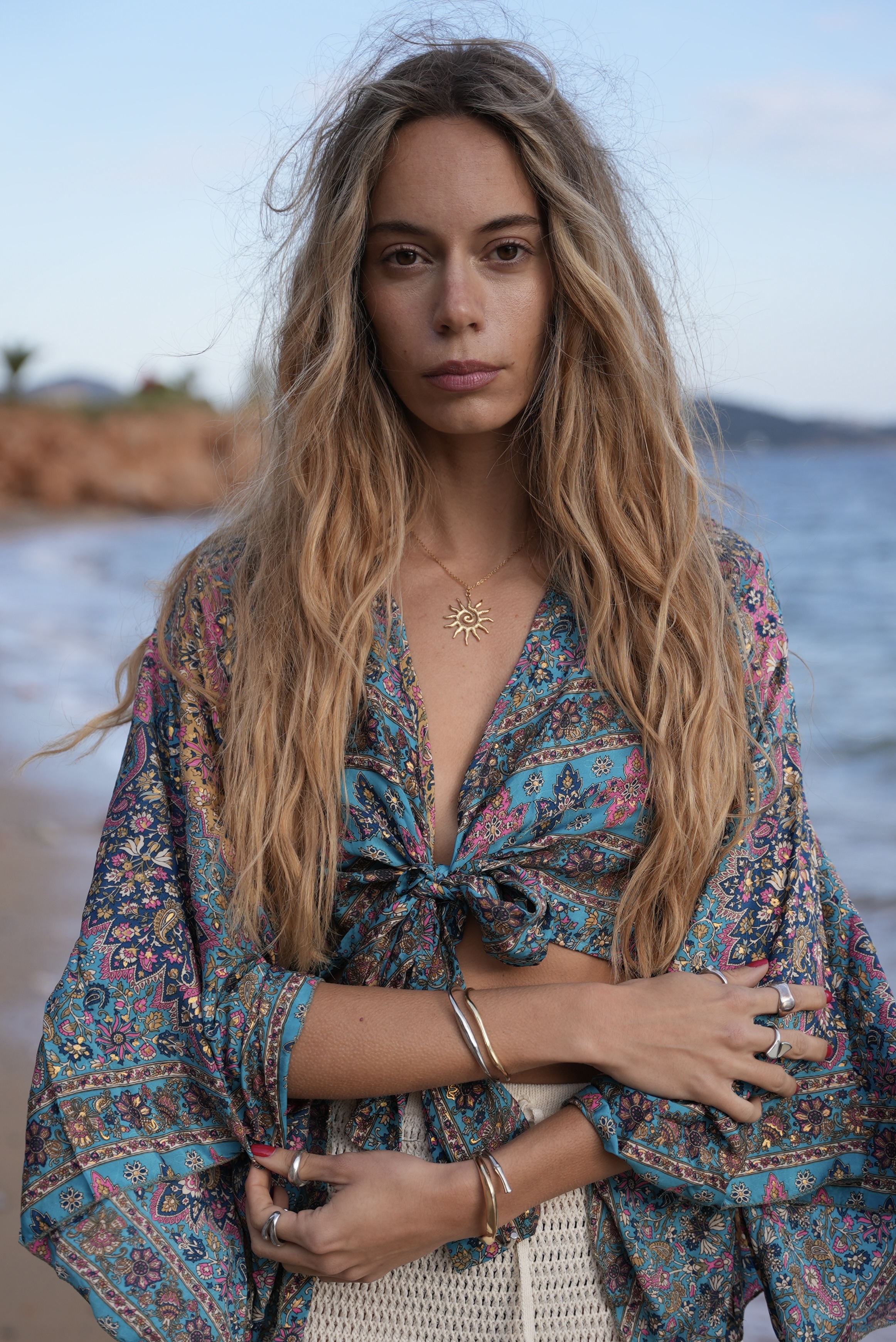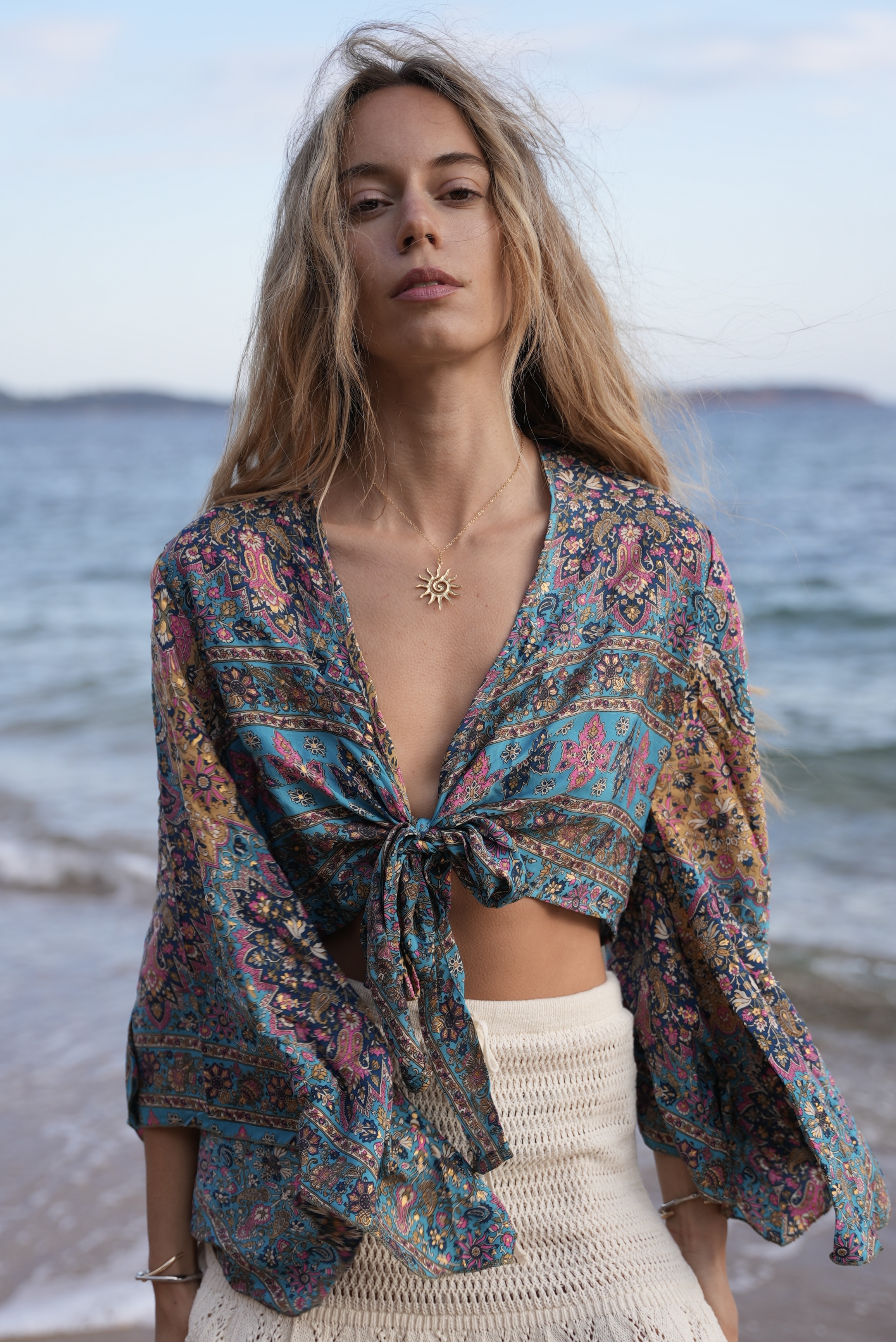 Wrap Shirt with gold details in ciel