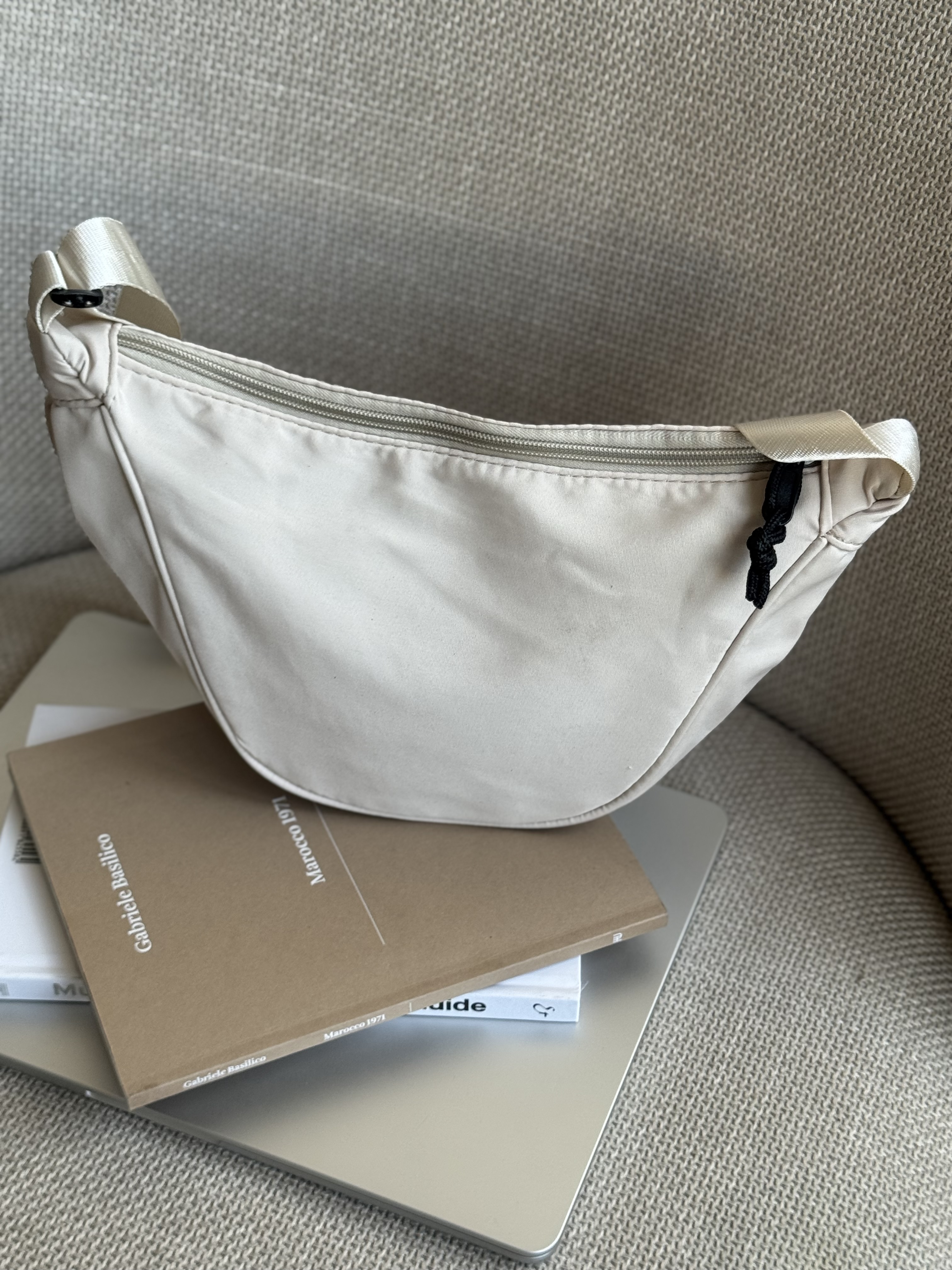Round bag with black details and adjustable strap in ivory