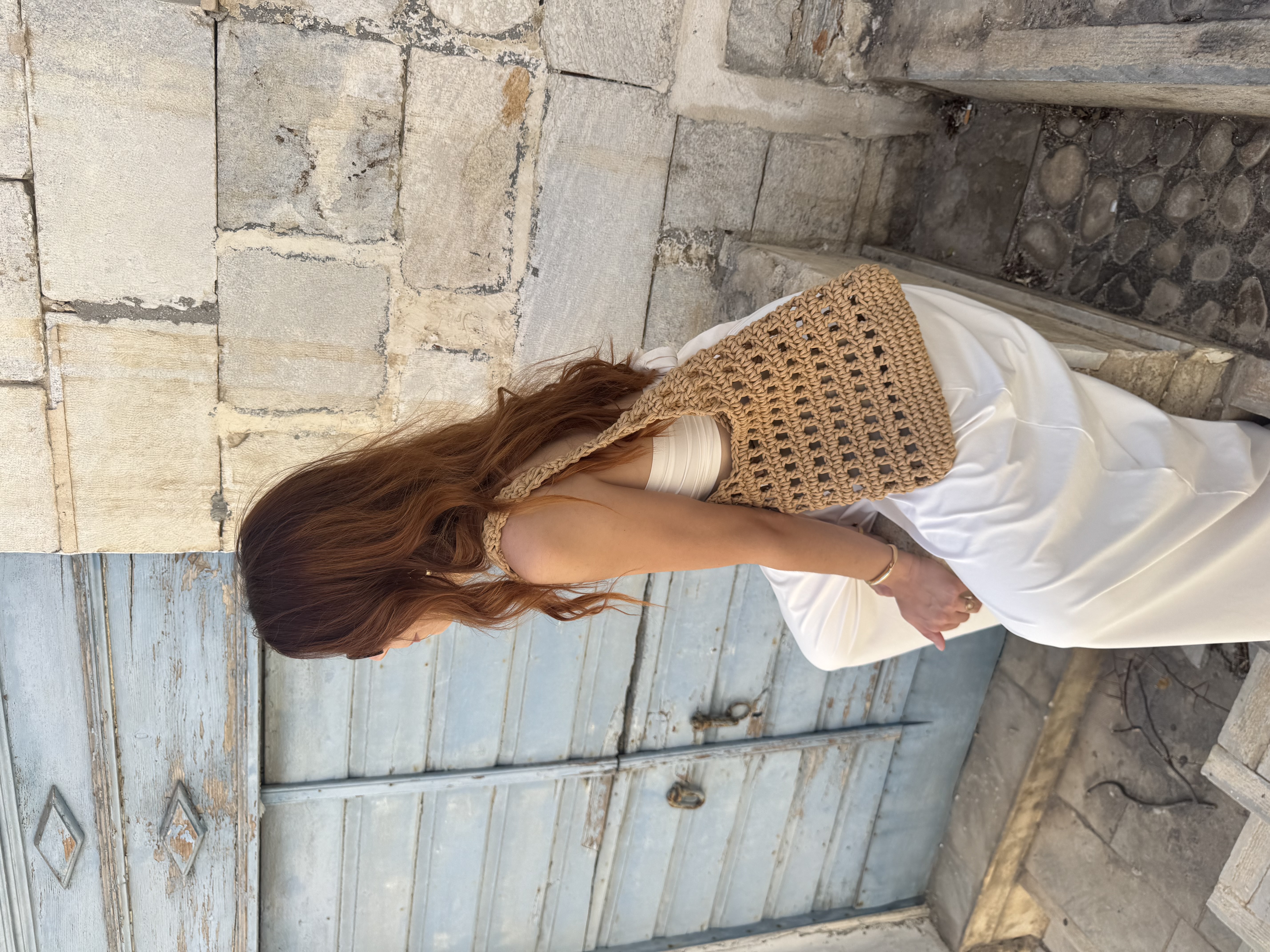 Net crochet typed bag in warm beige