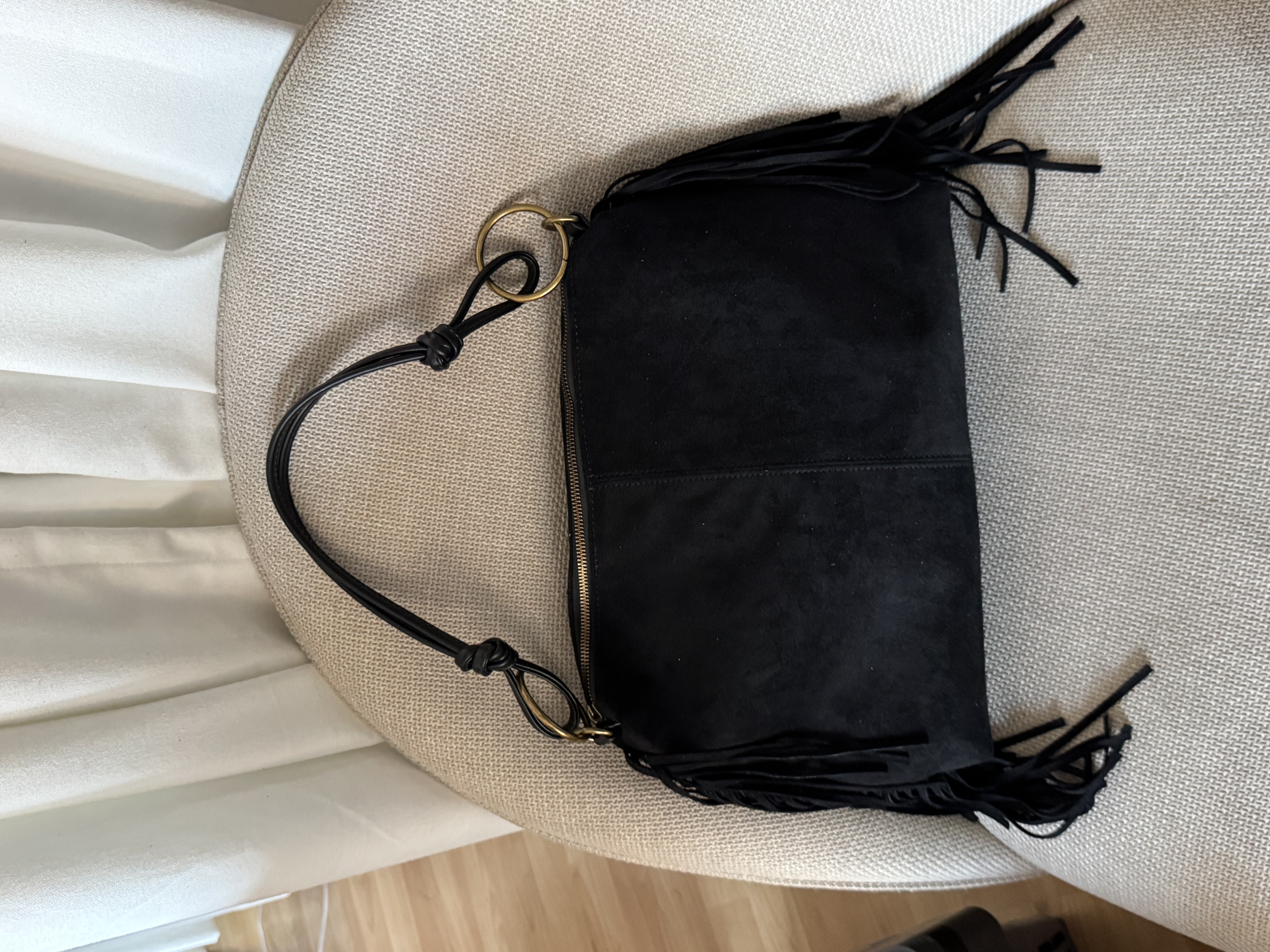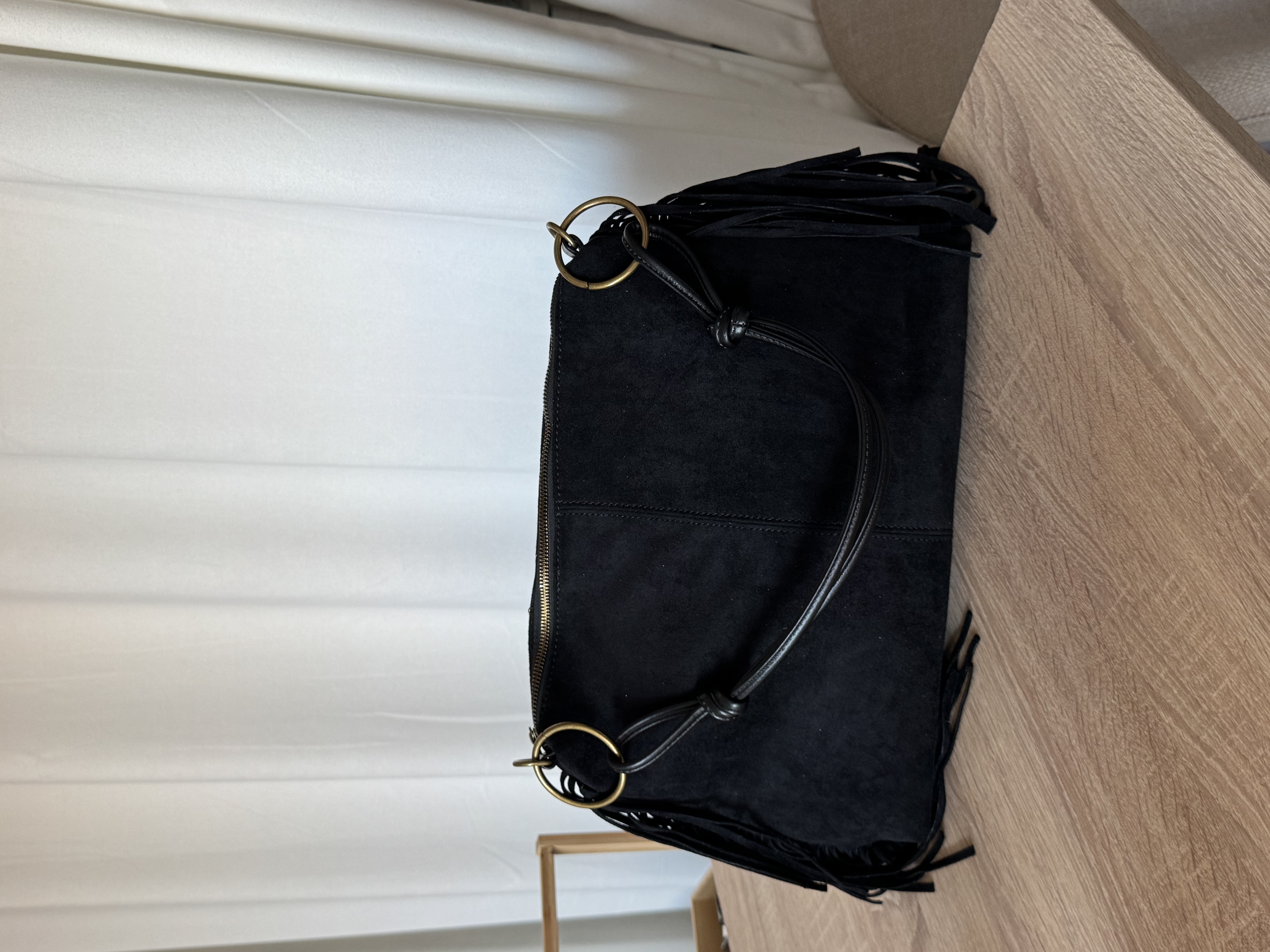 Vegan suede bag with hoops and adjustable strap in black