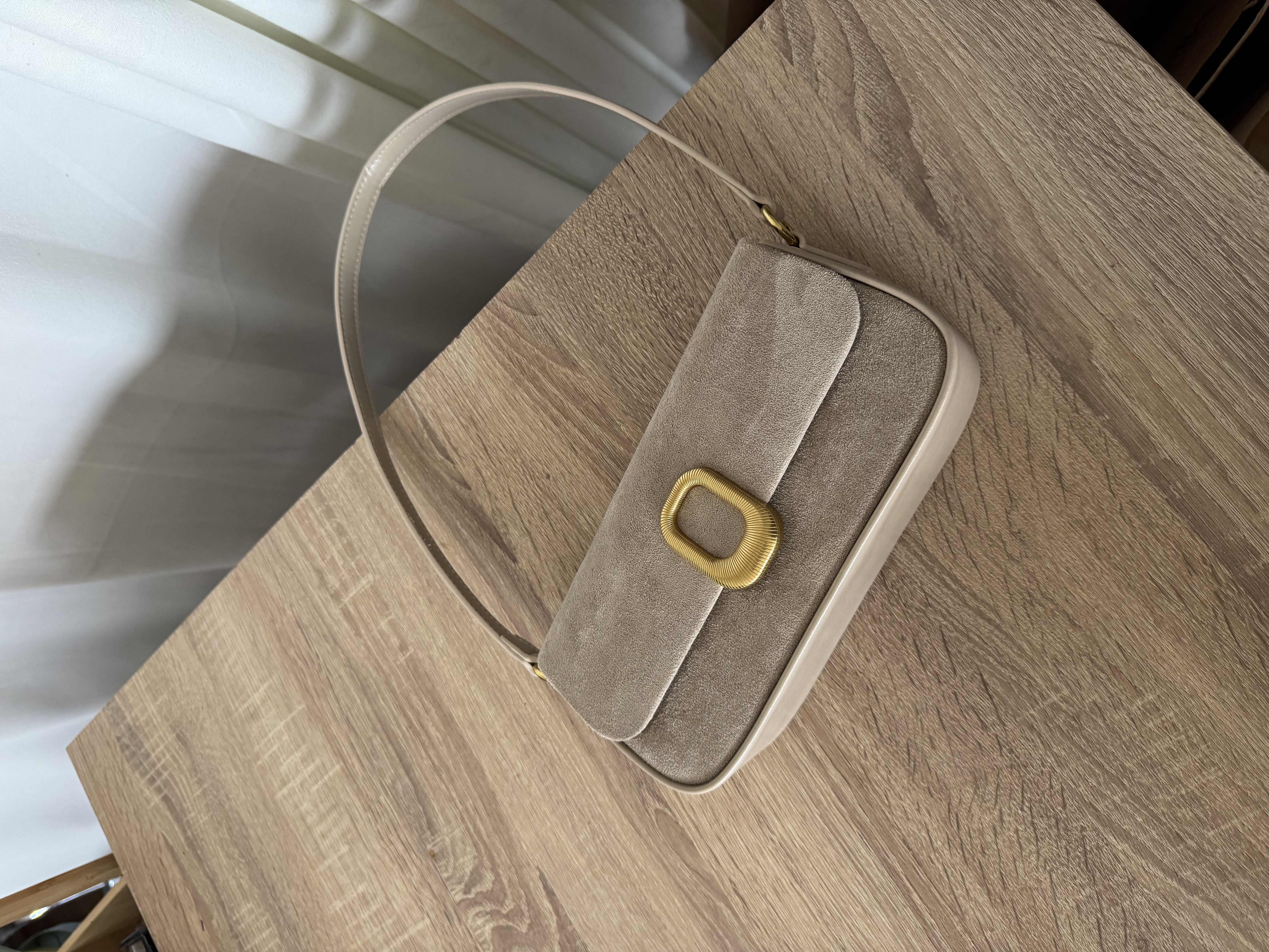 Vegan Suede shoulder bag with gold detail in almond