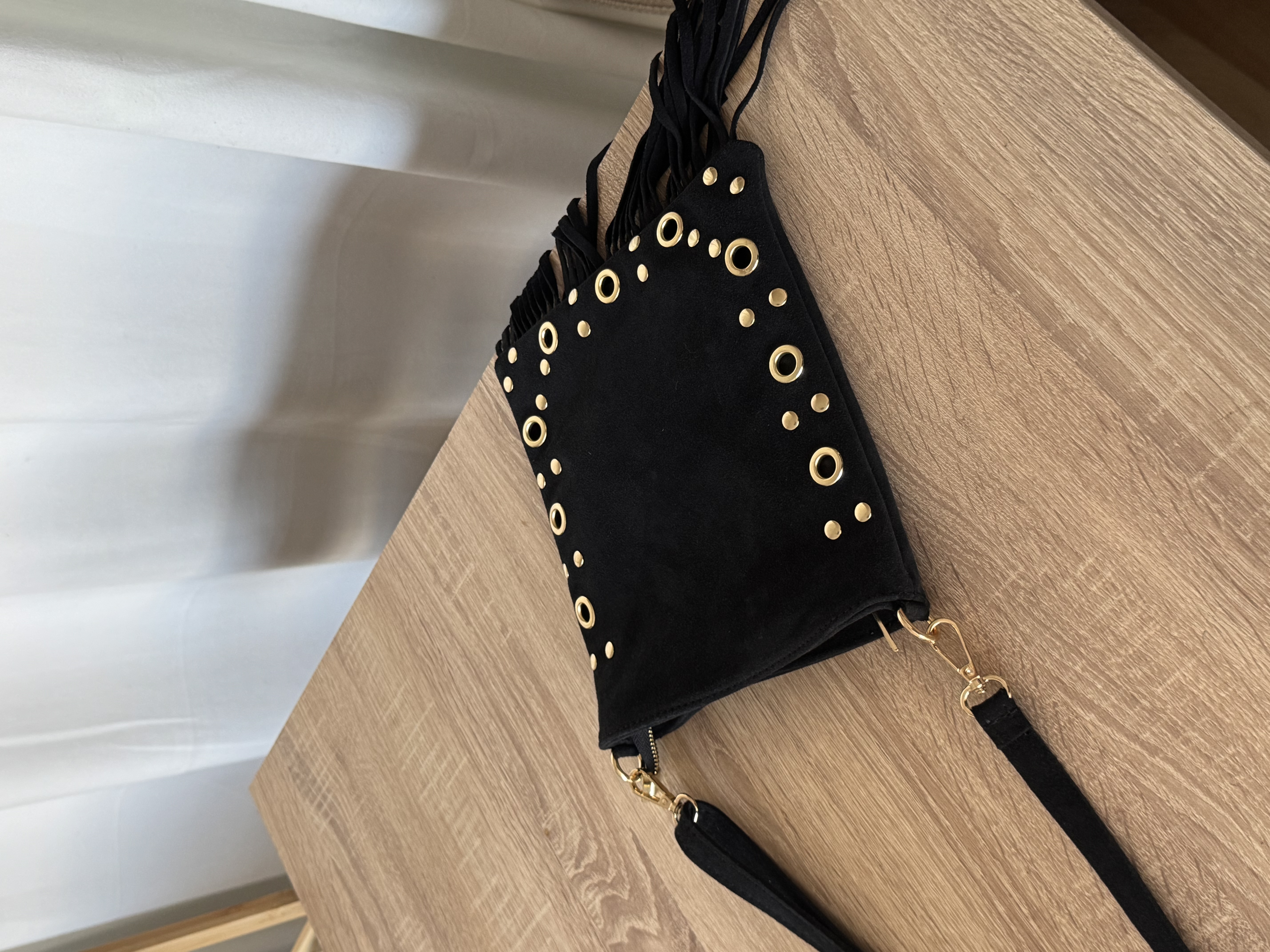 Suede crossbody bag with fringes and studs in black