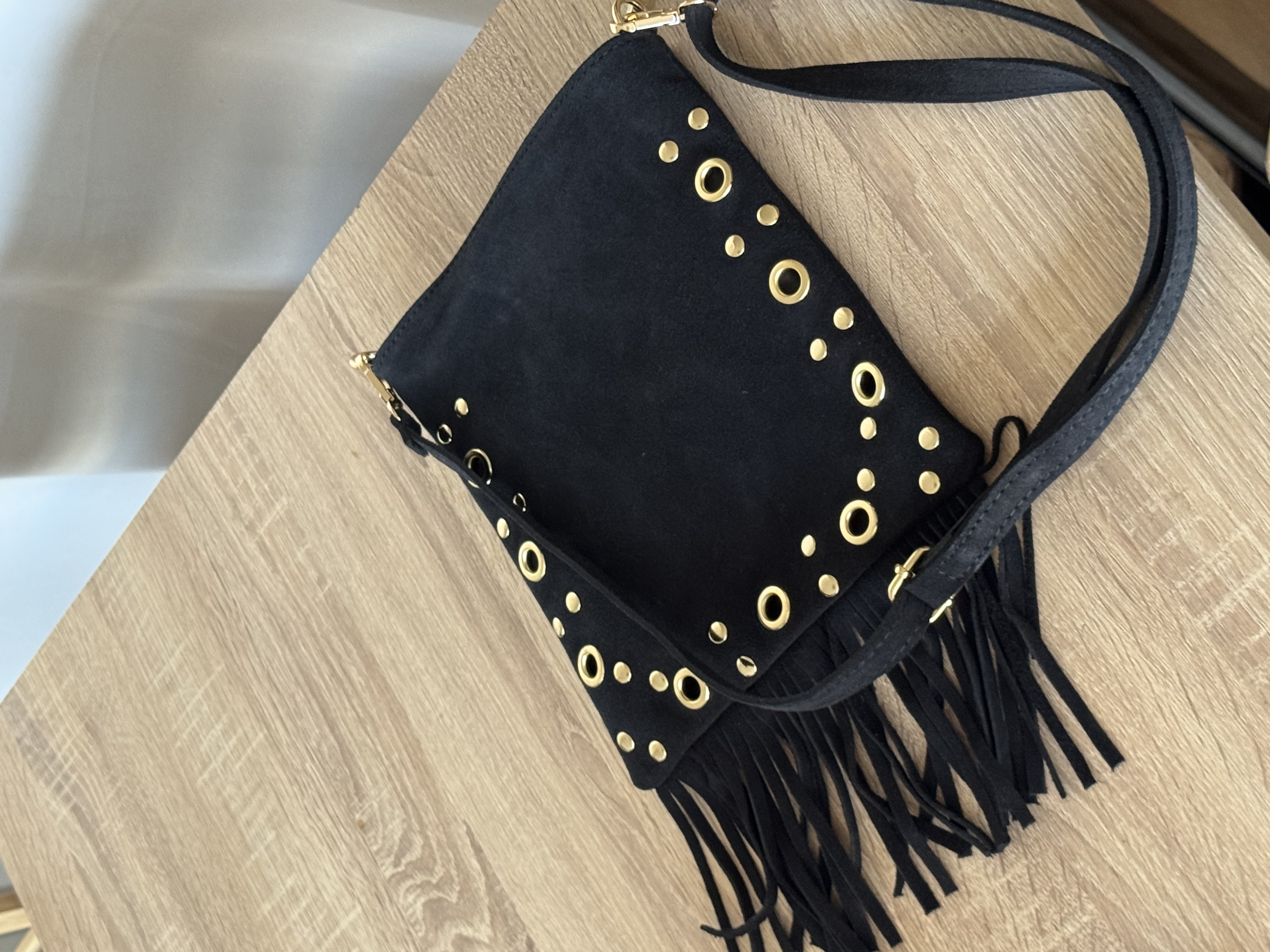 Suede crossbody bag with fringes and studs