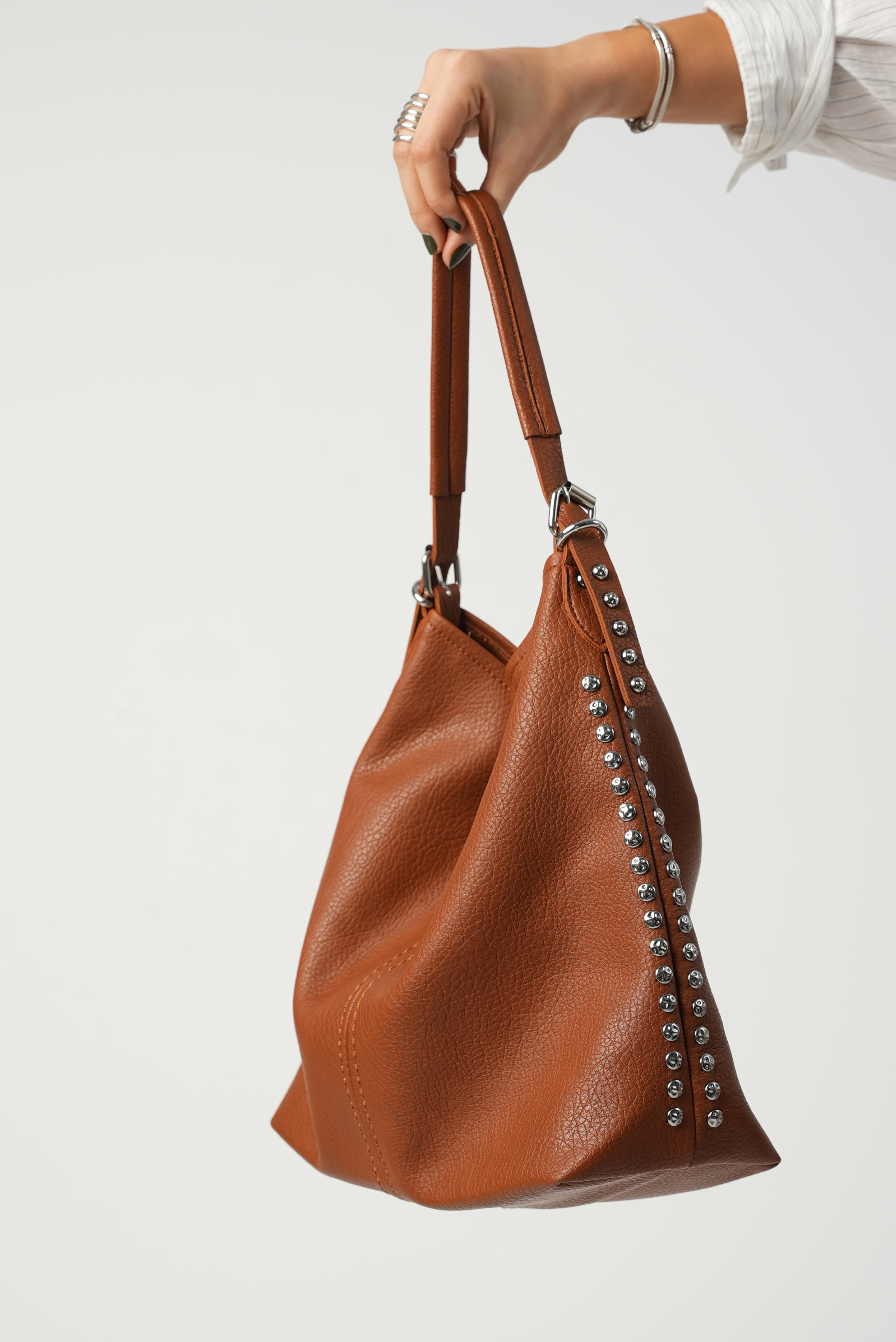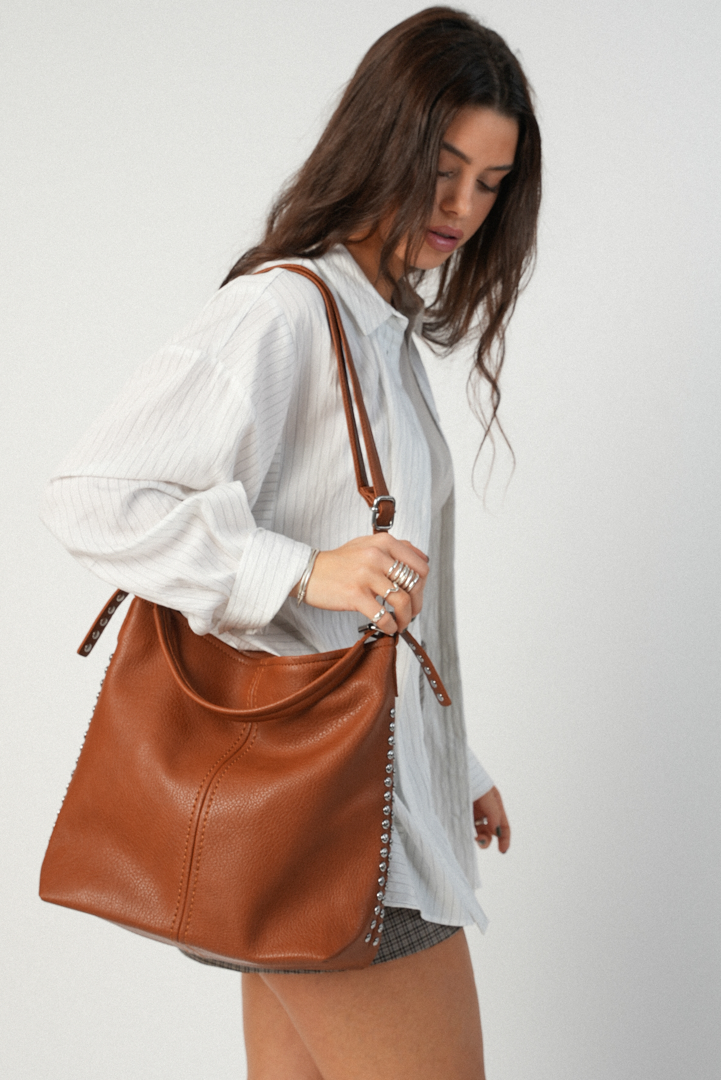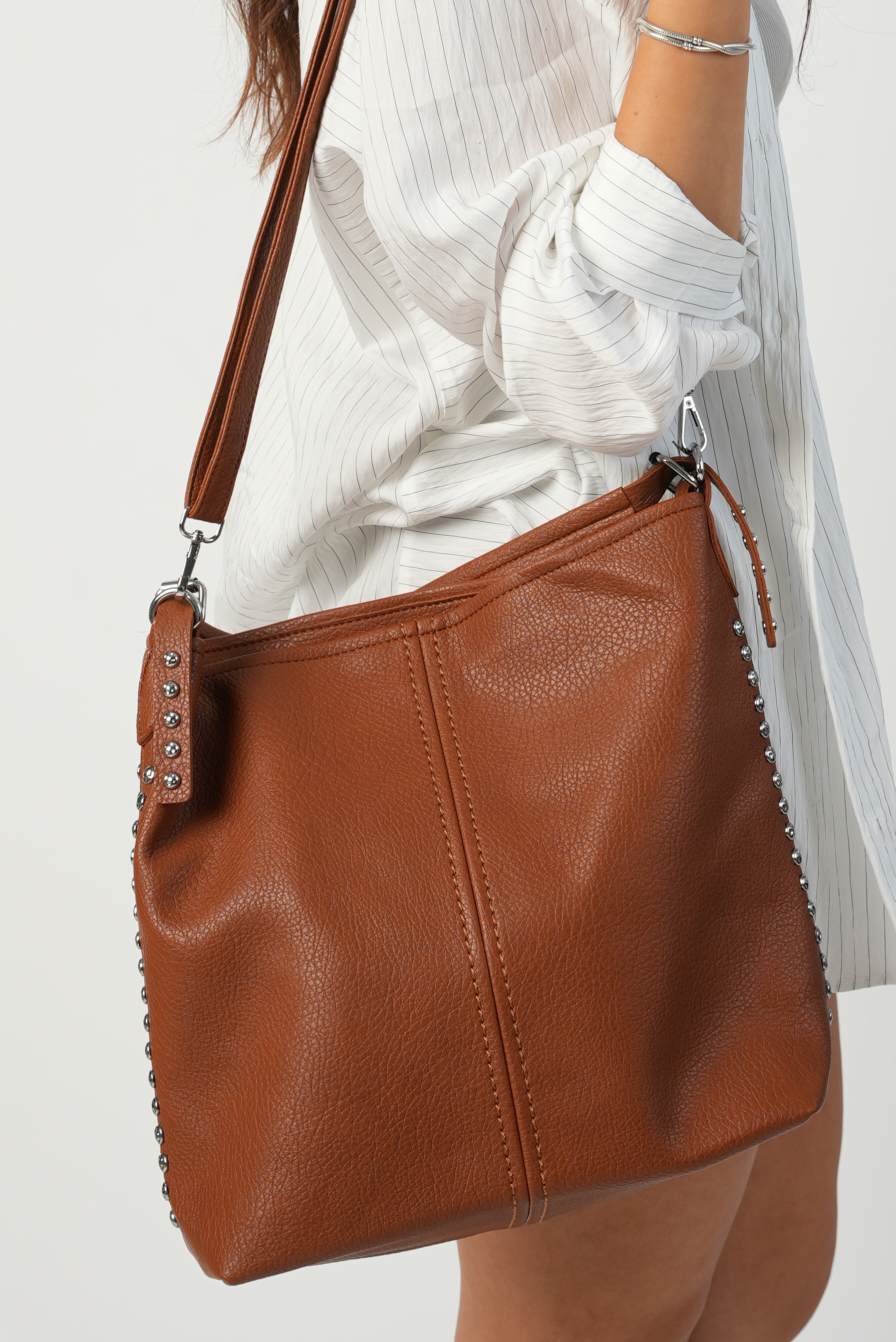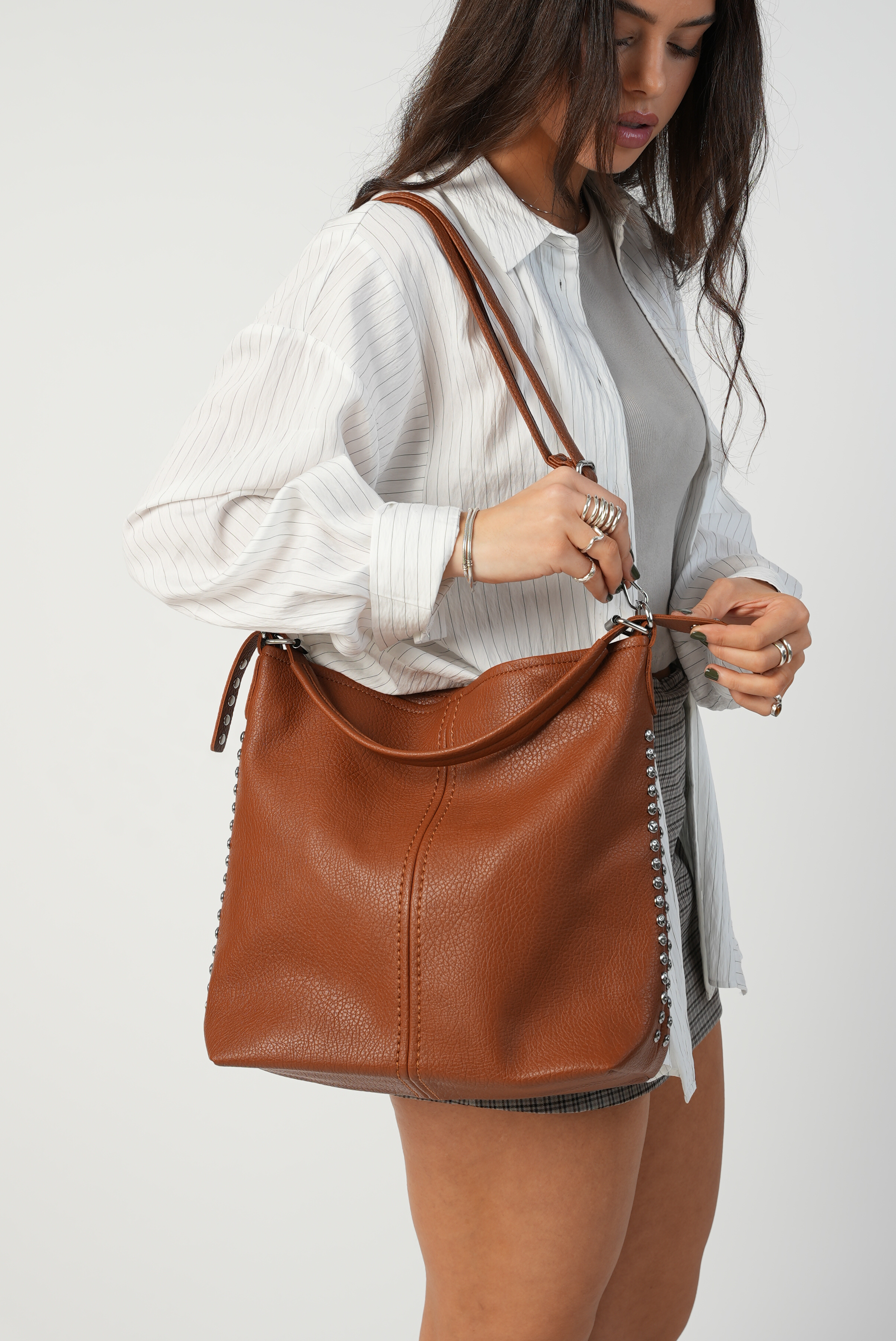 Vegan bucket bag with studs in brown