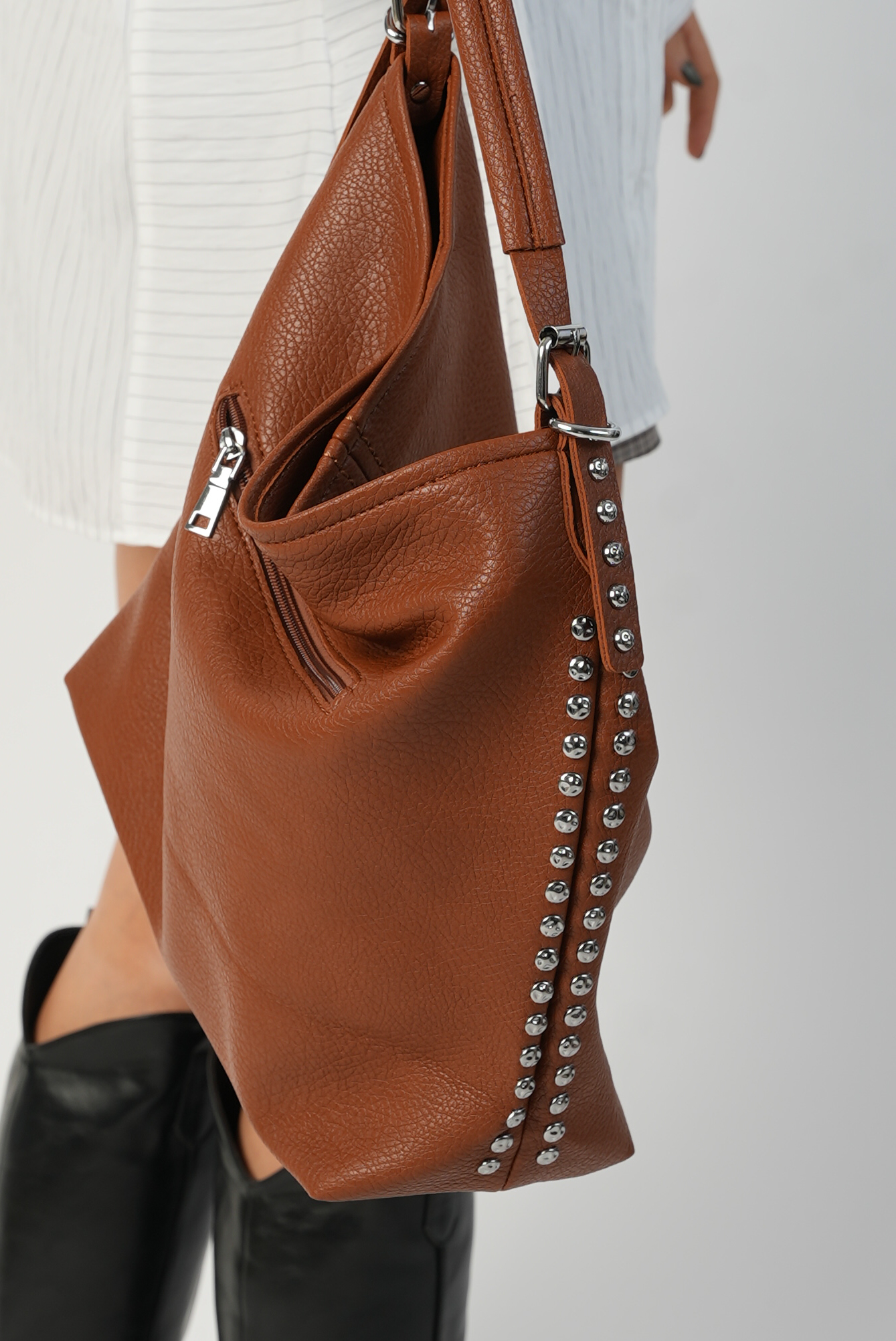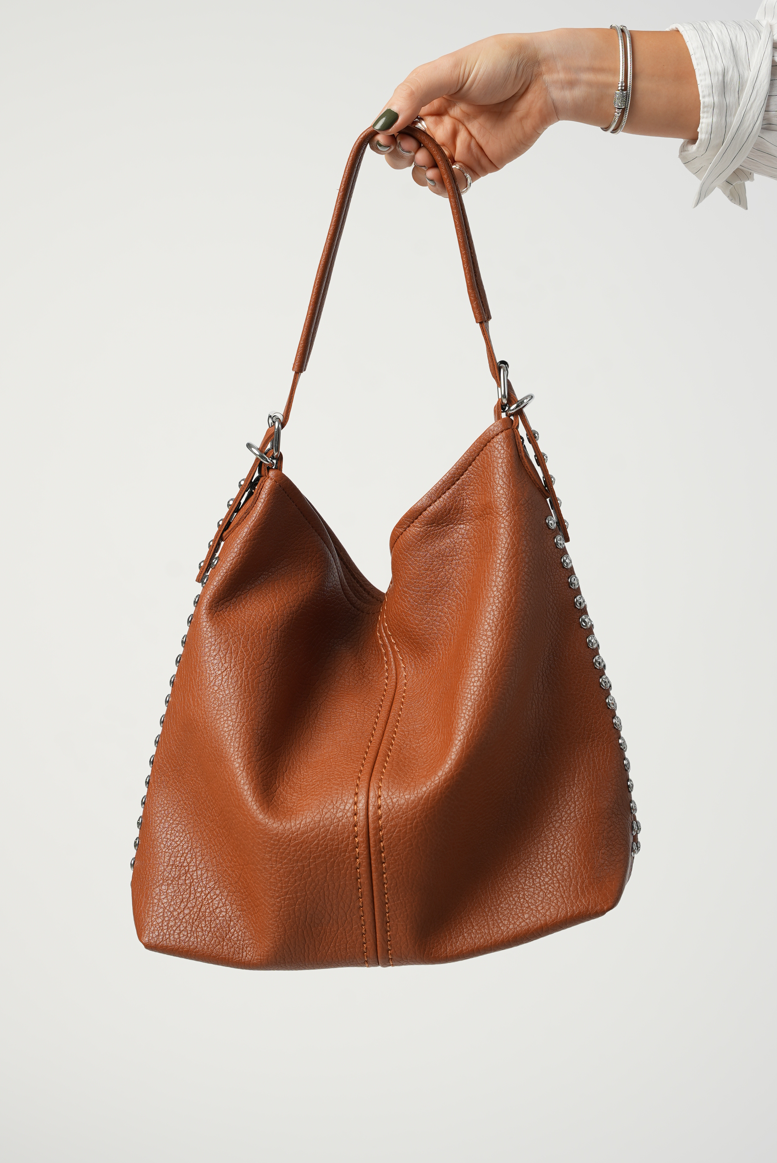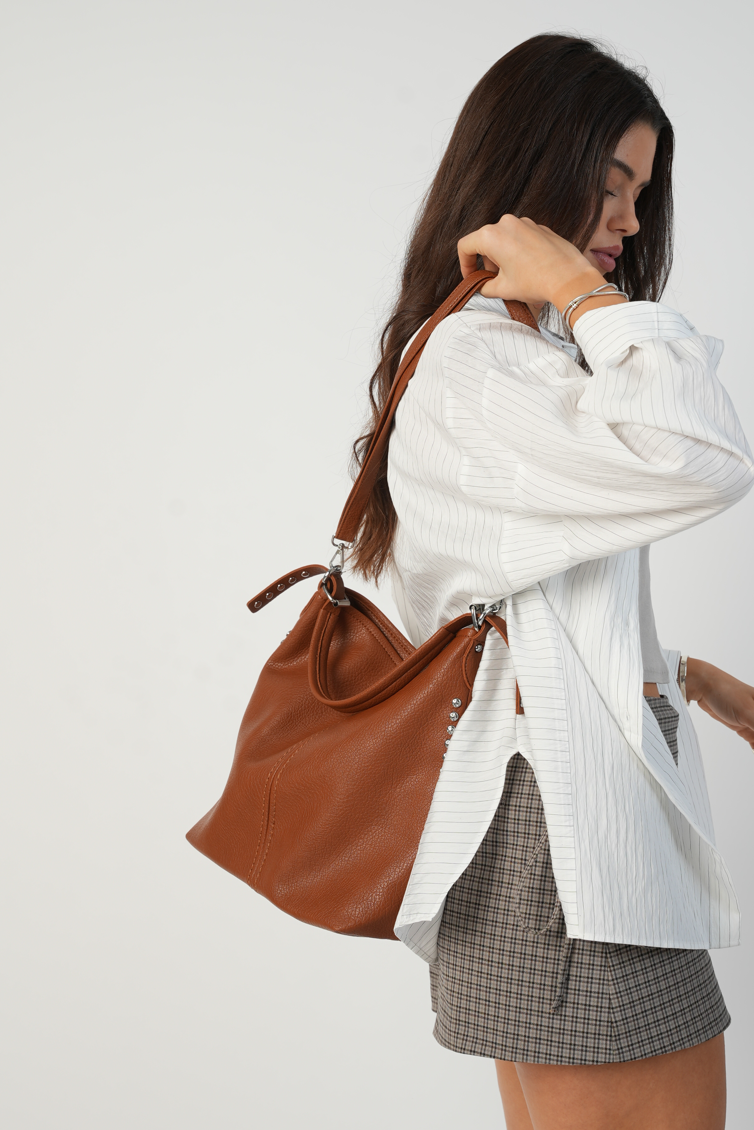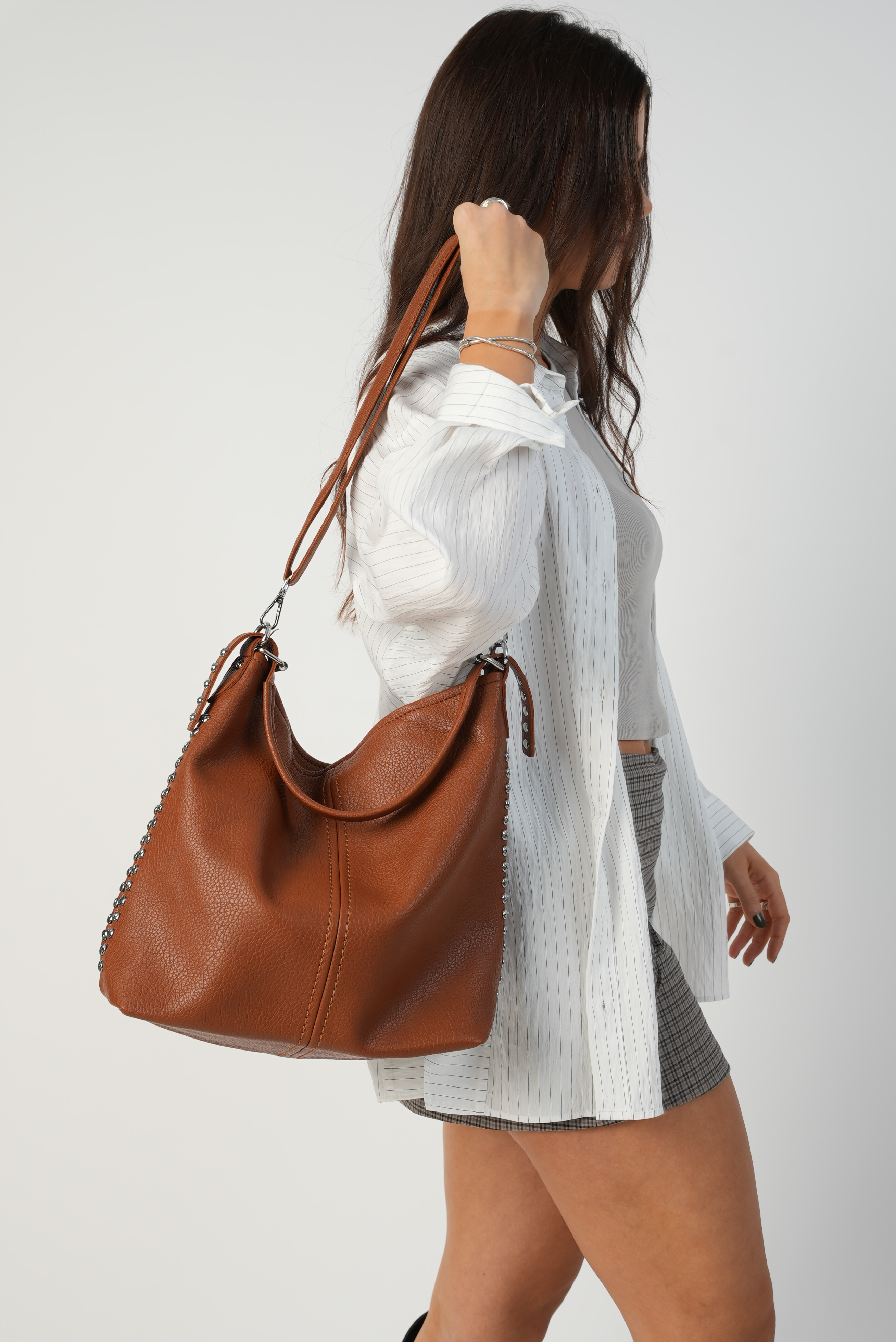Vegan bucket bag with studs in brown