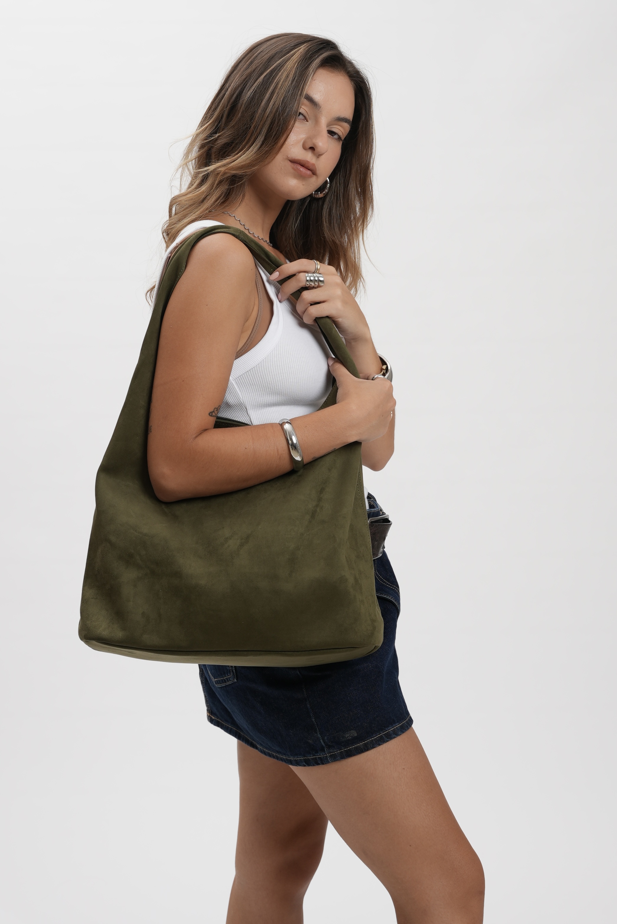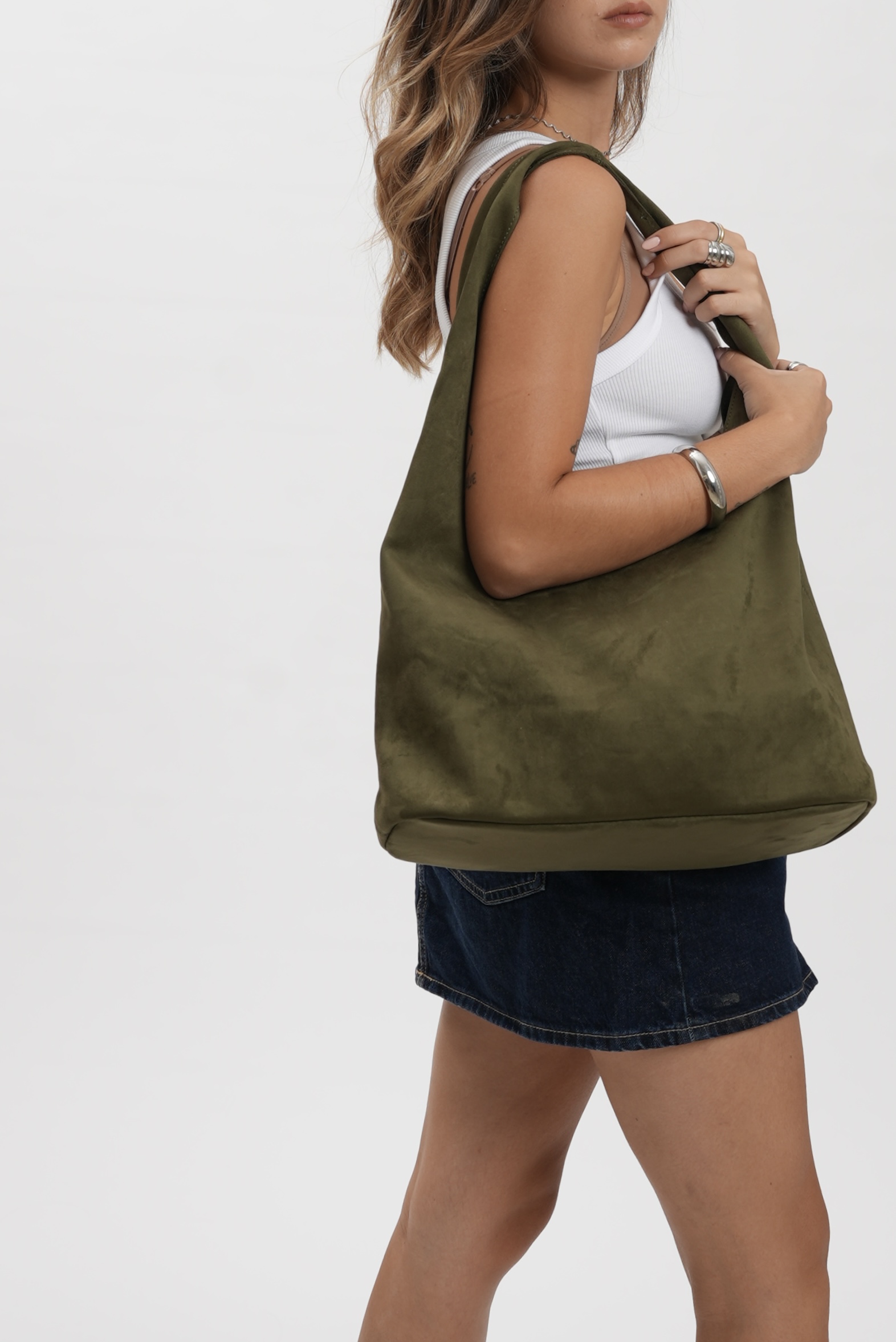 Vegan suede tote bag with zipper in moss green