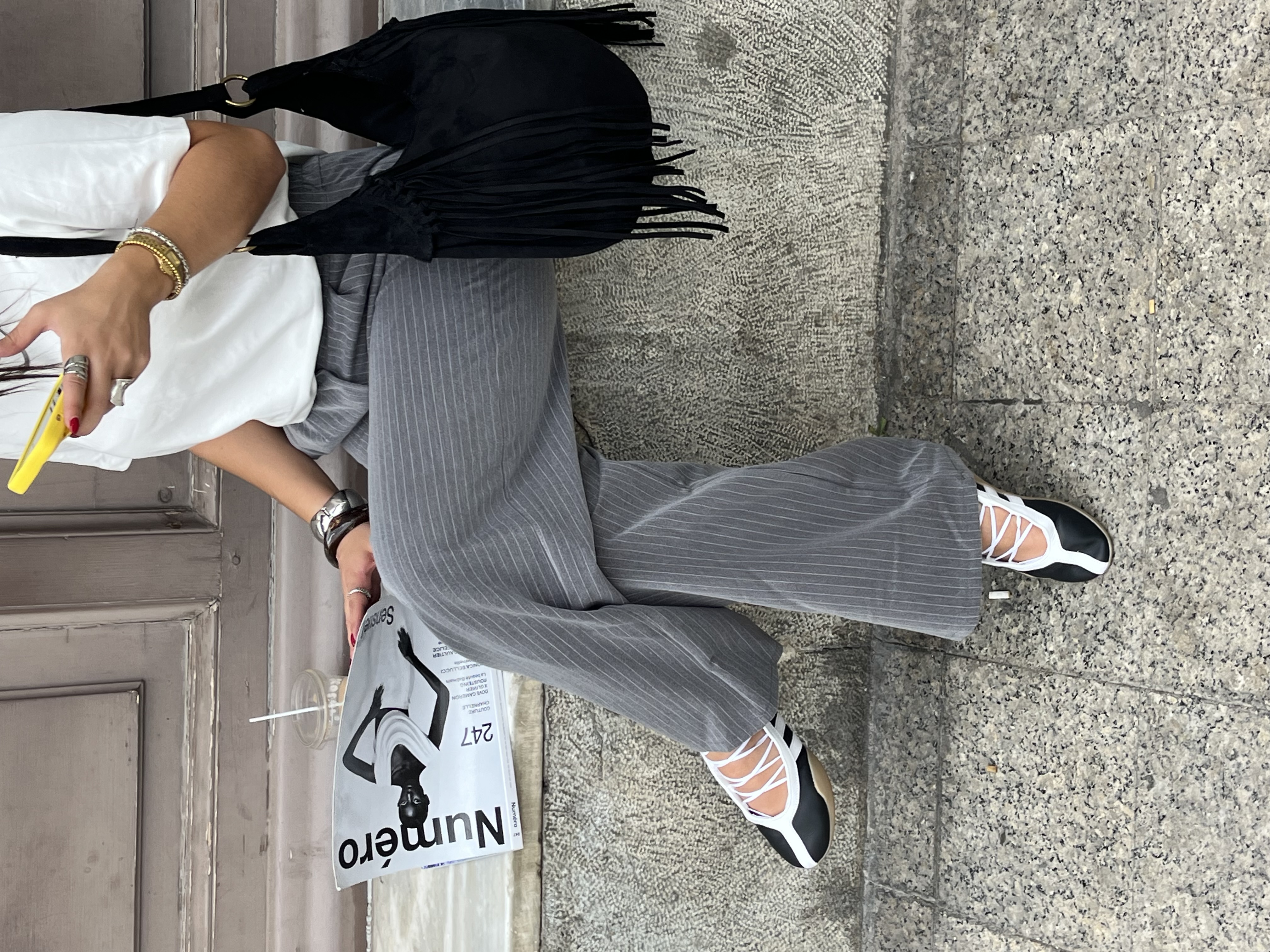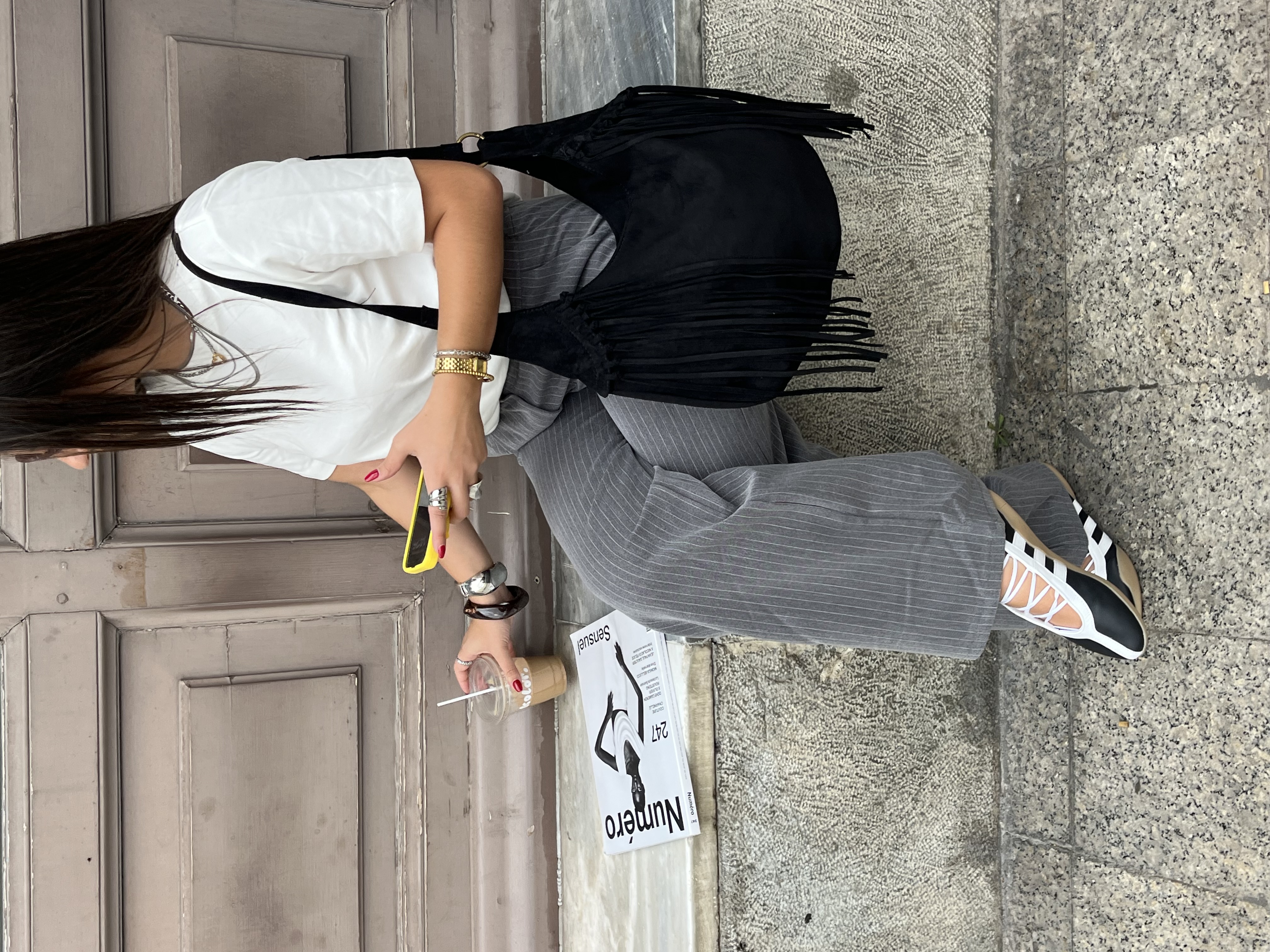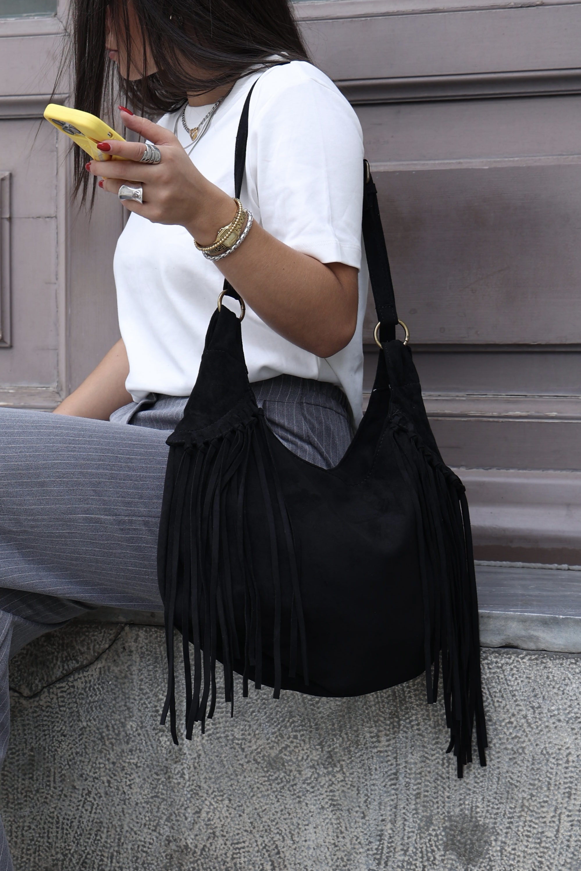 Vegan suede saddle bag with fringe in black