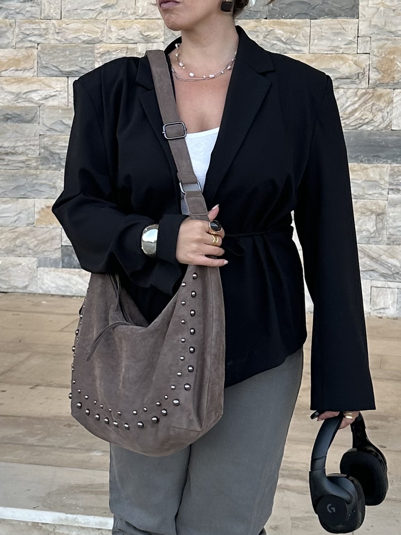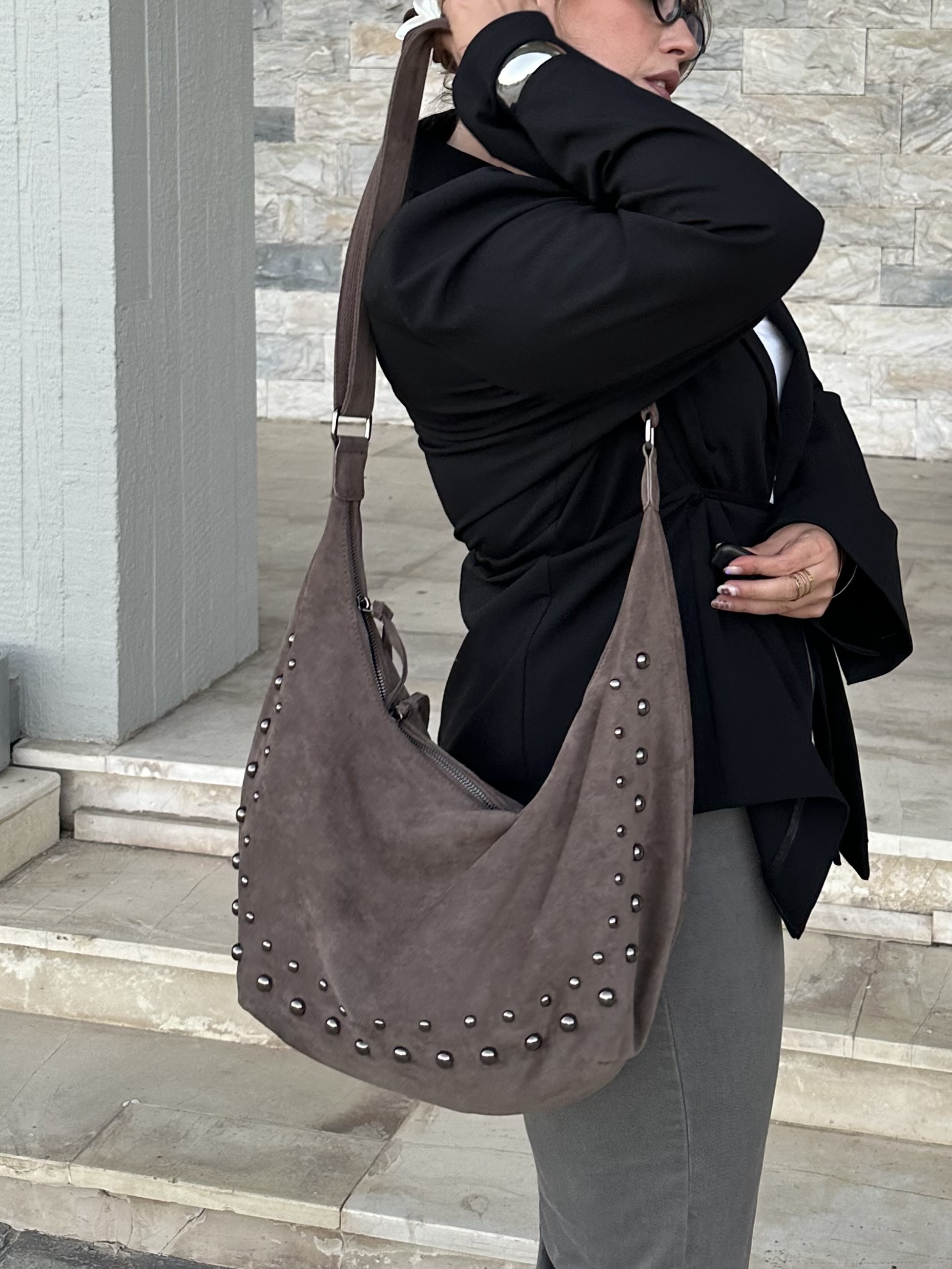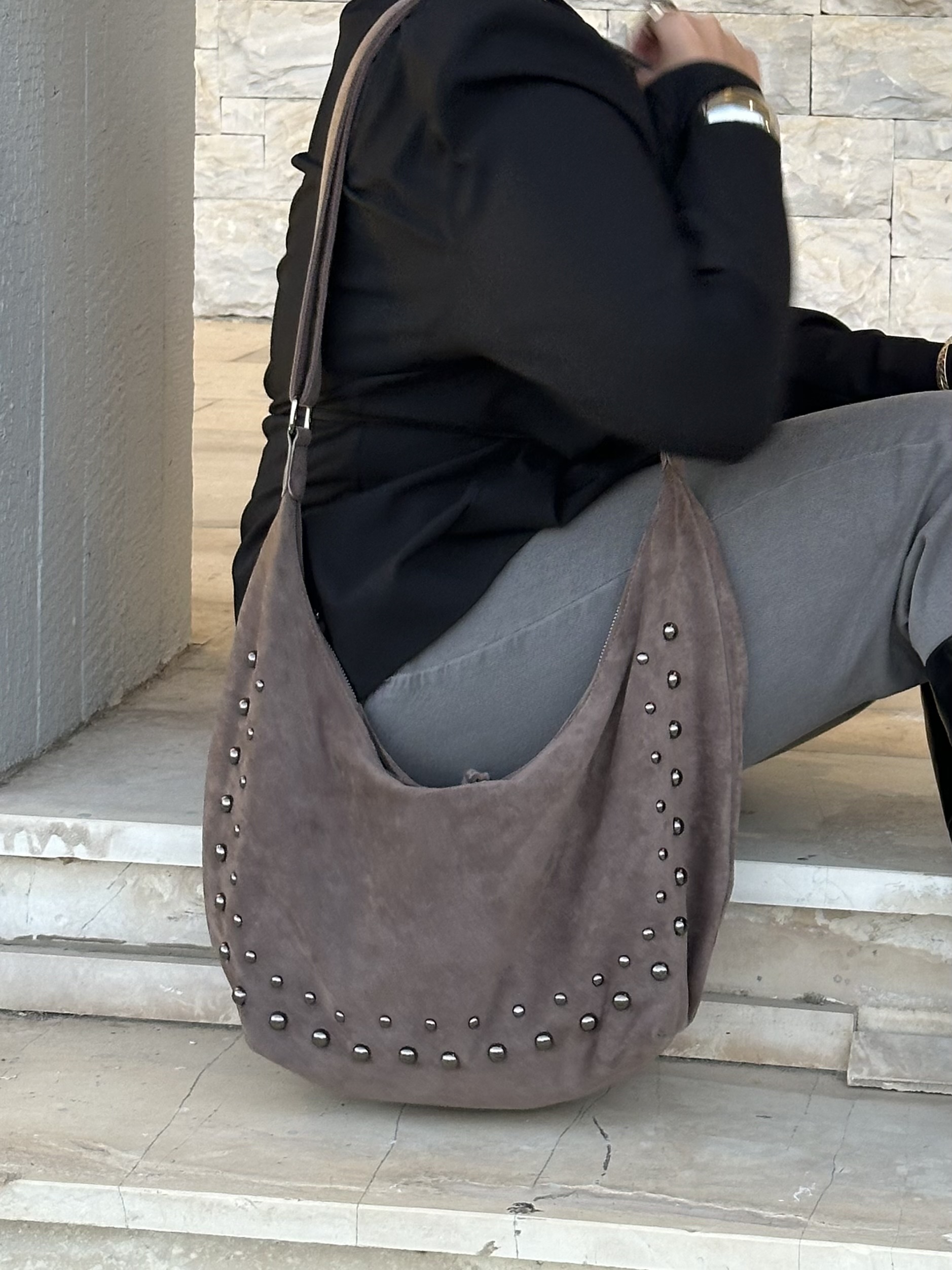 Vegan suede saddle bag with studs in taupe