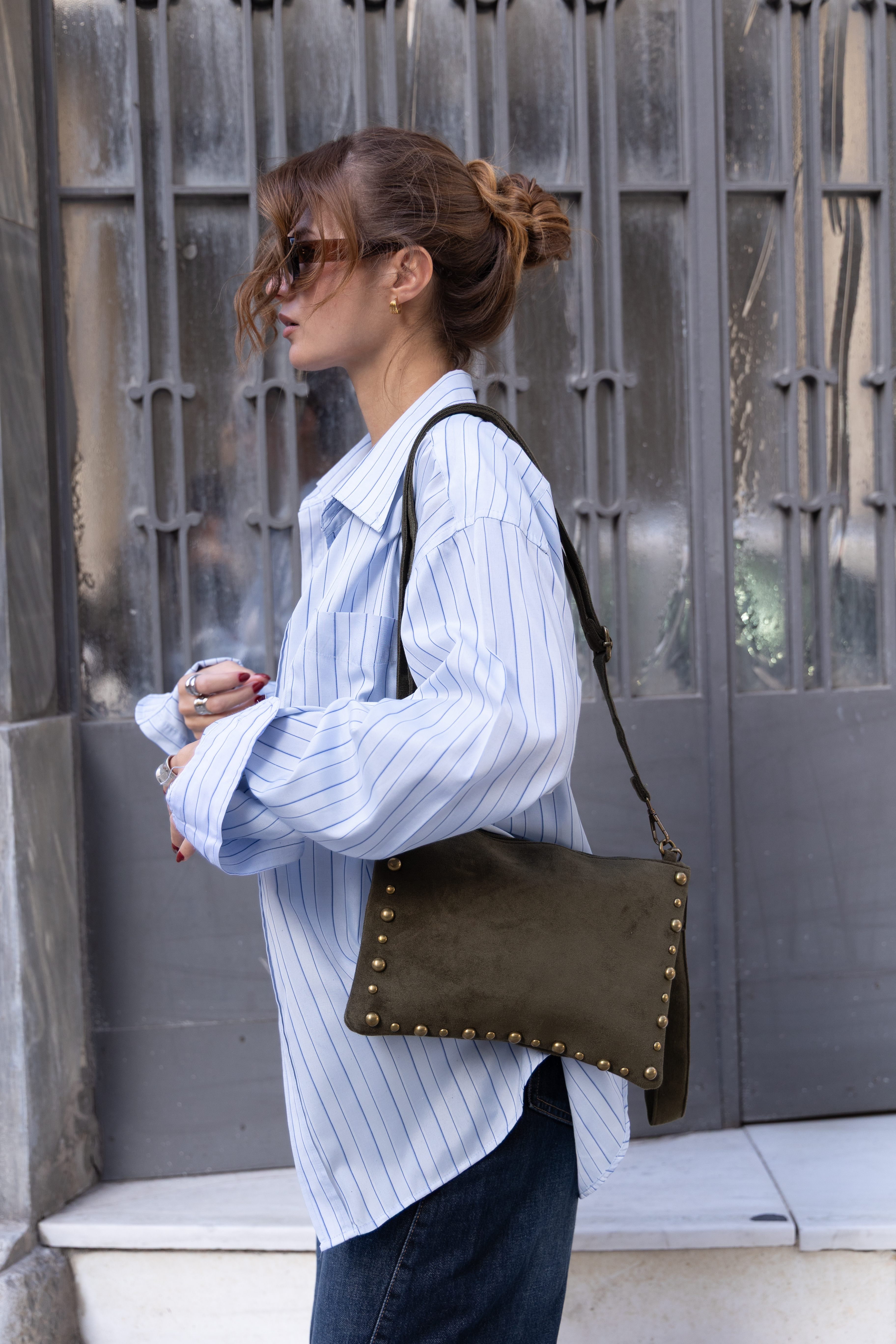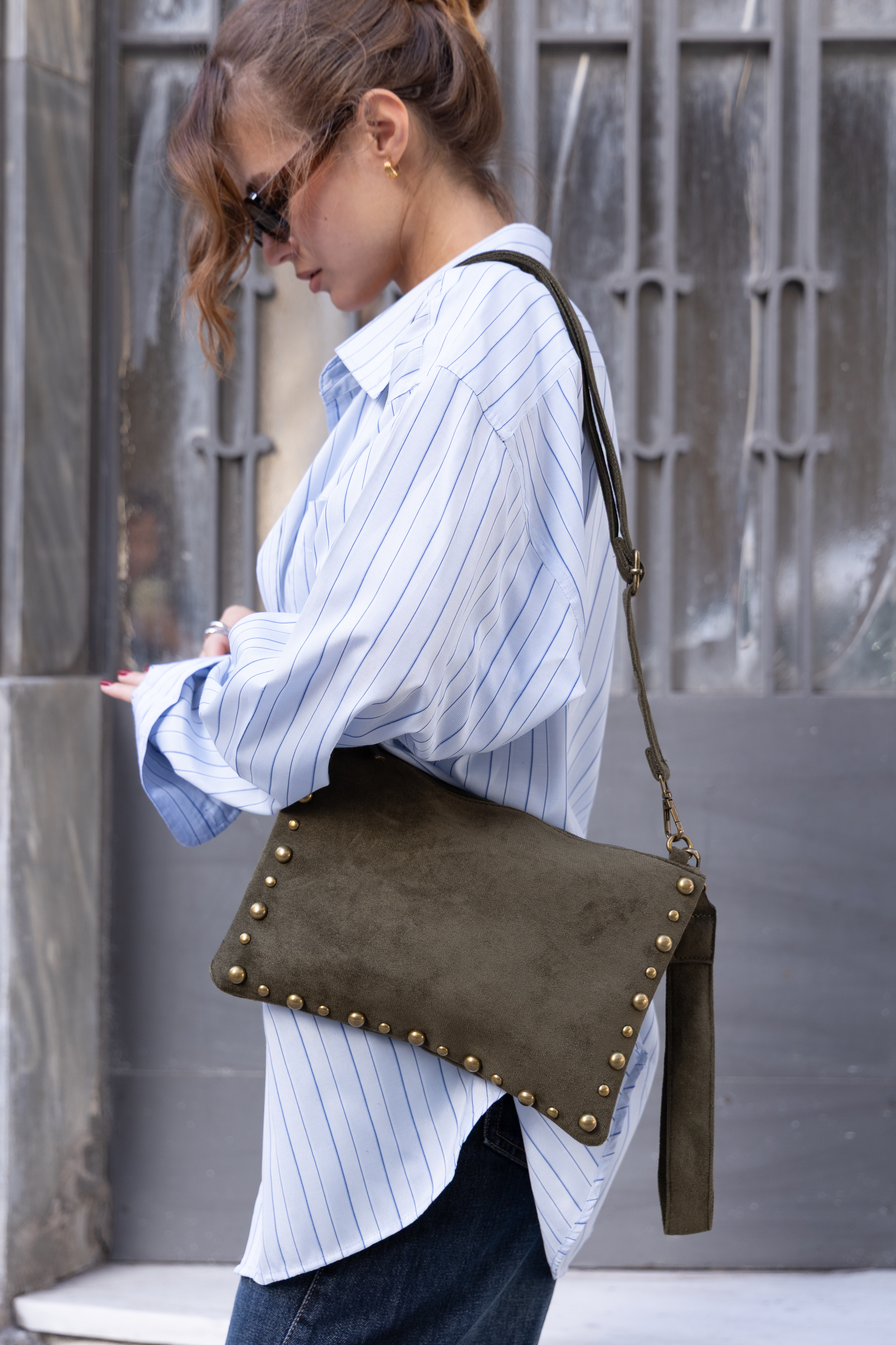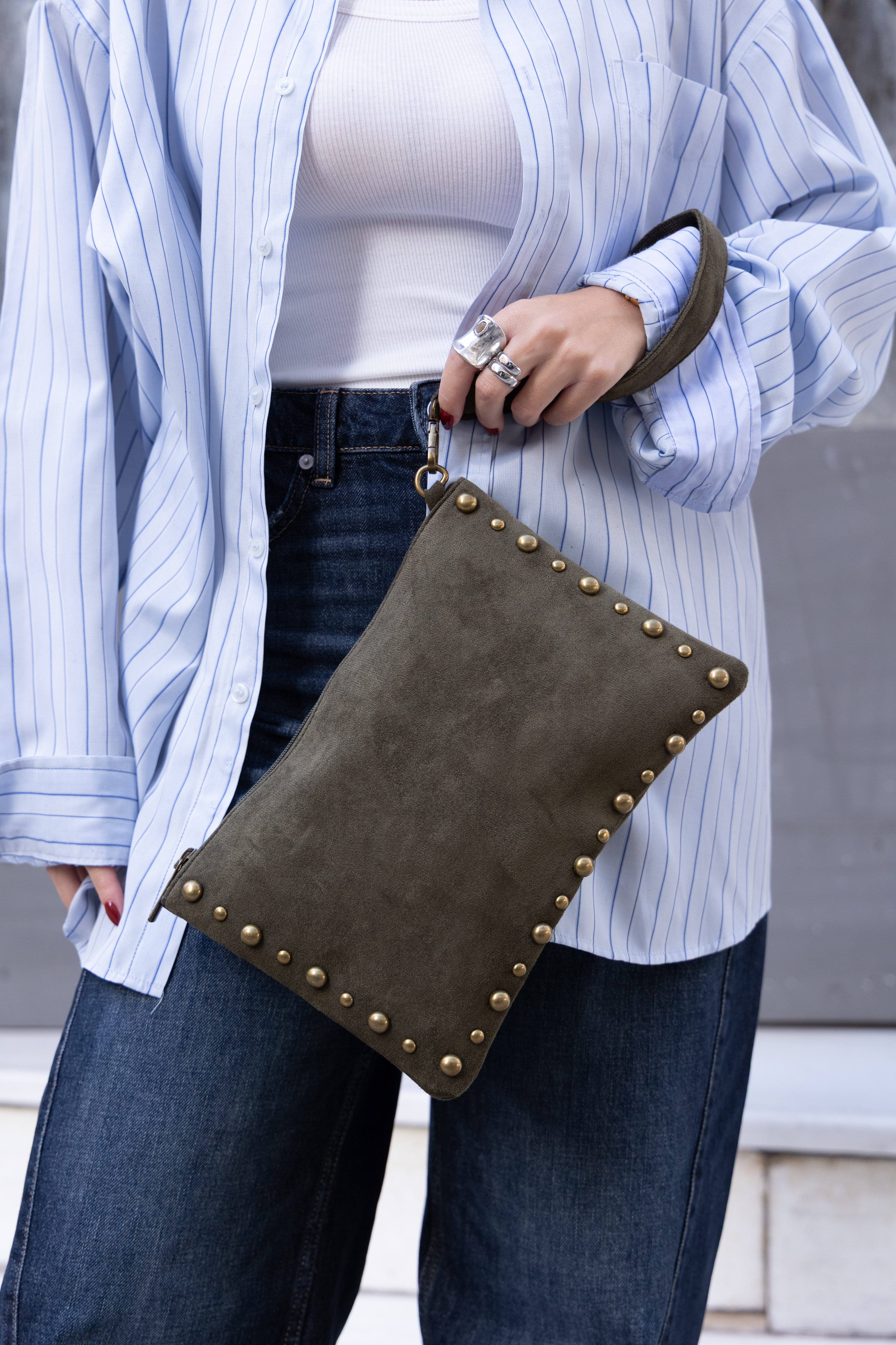 Vegan Suede hand bag with studs in olive green