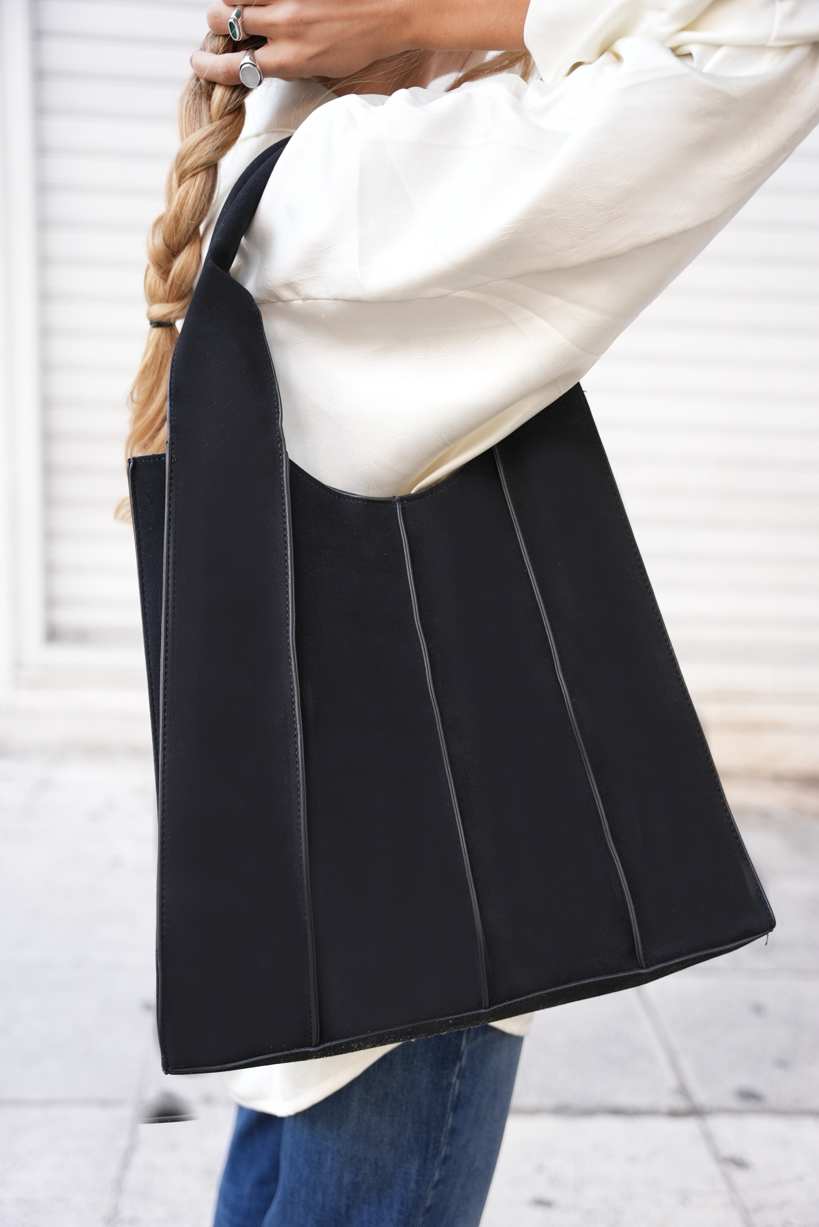 Vegan suede mom bag with lines in black