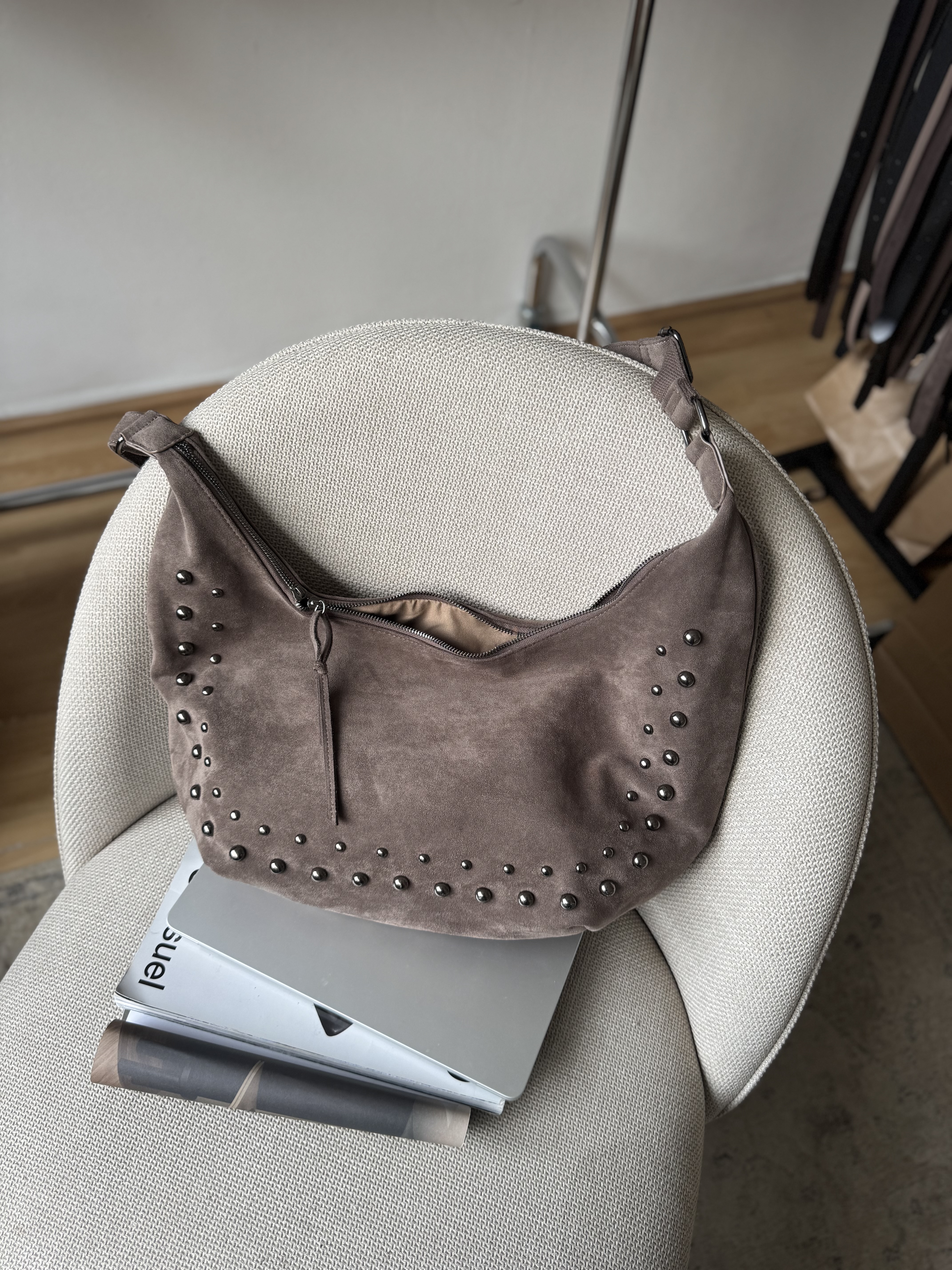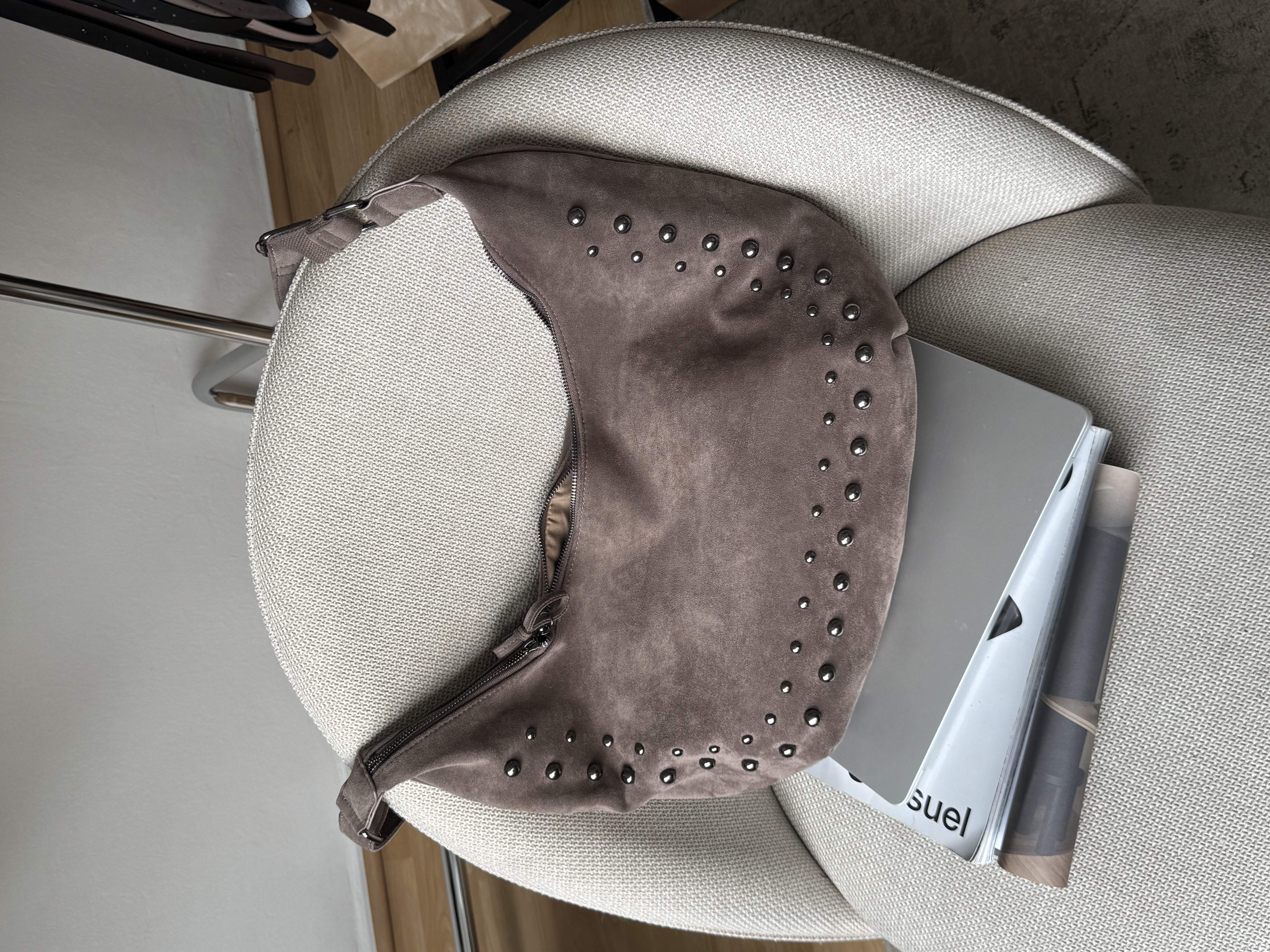 IMPERFECT Vegan suede saddle bag with studs in taupe