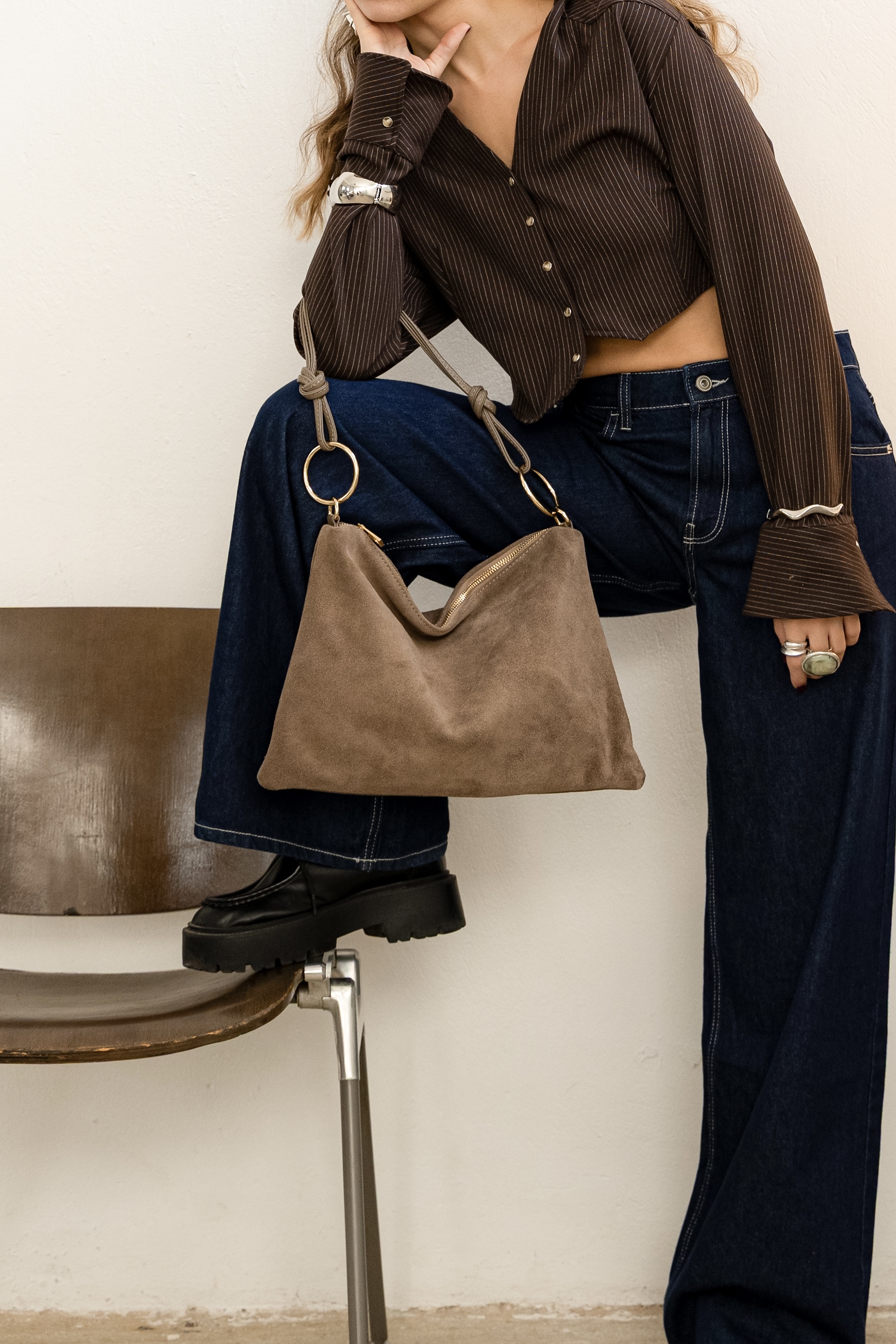 Large Suede shoulder bag with hoops