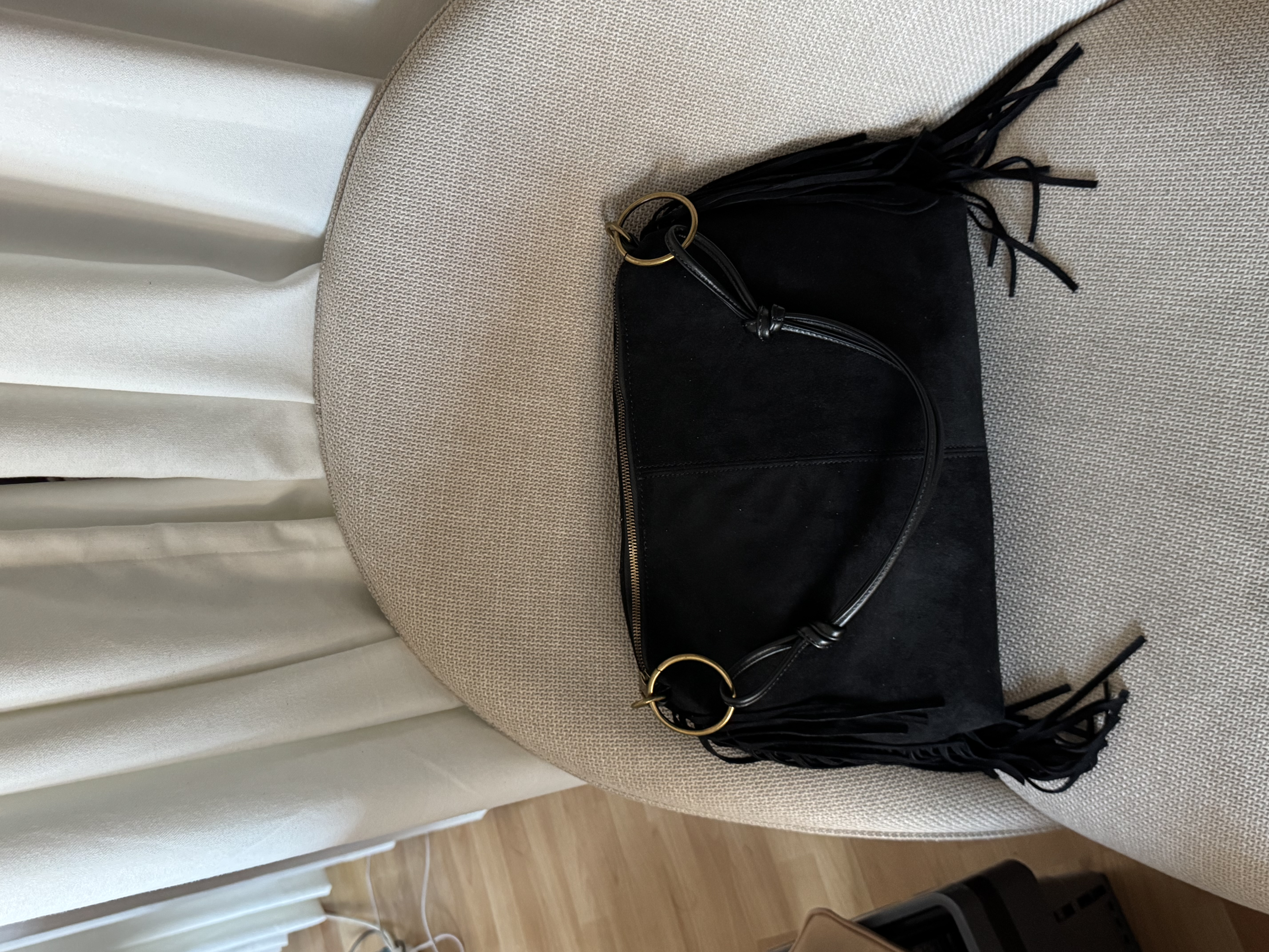 Vegan suede bag with hoops and adjustable strap in black