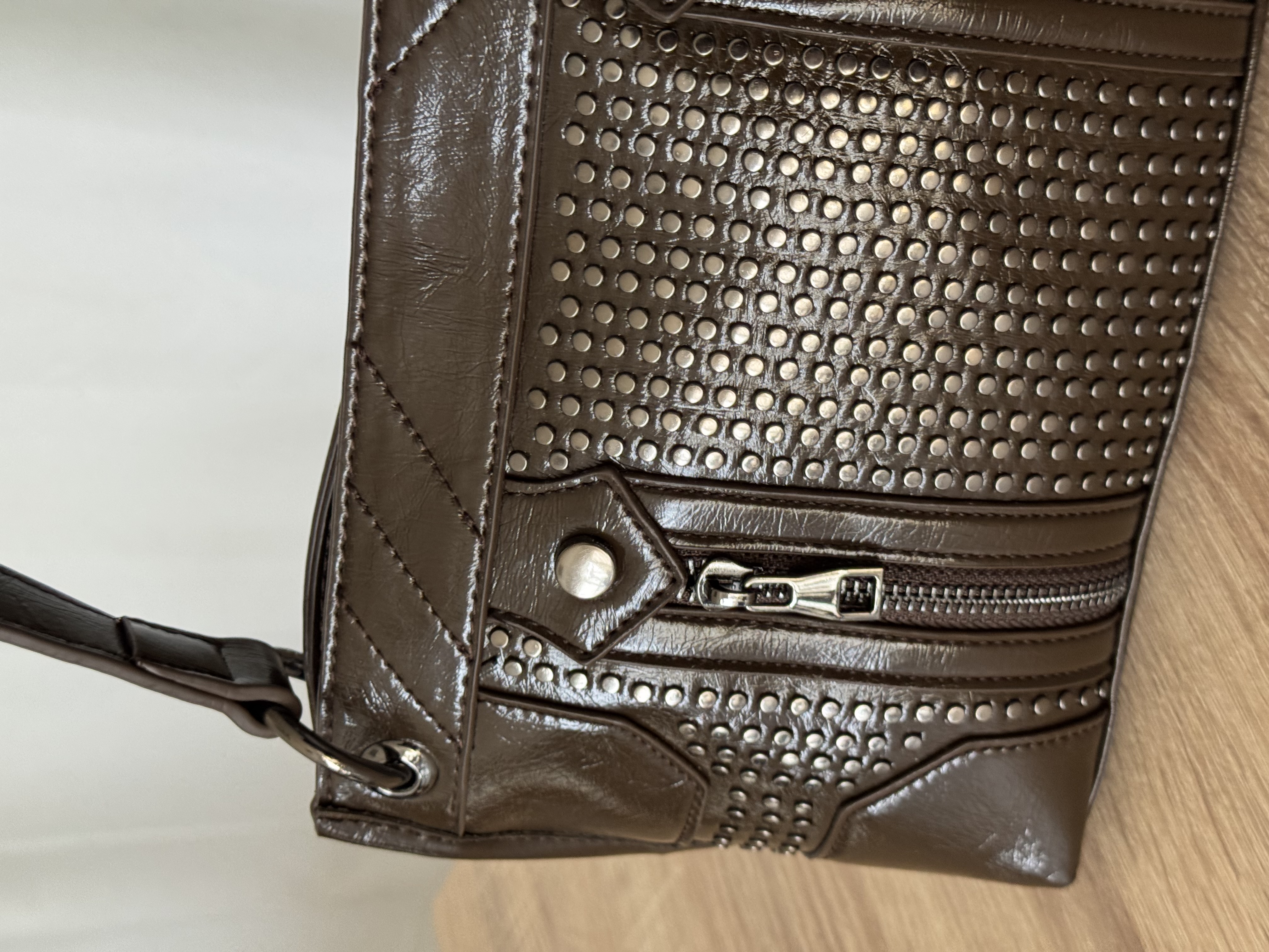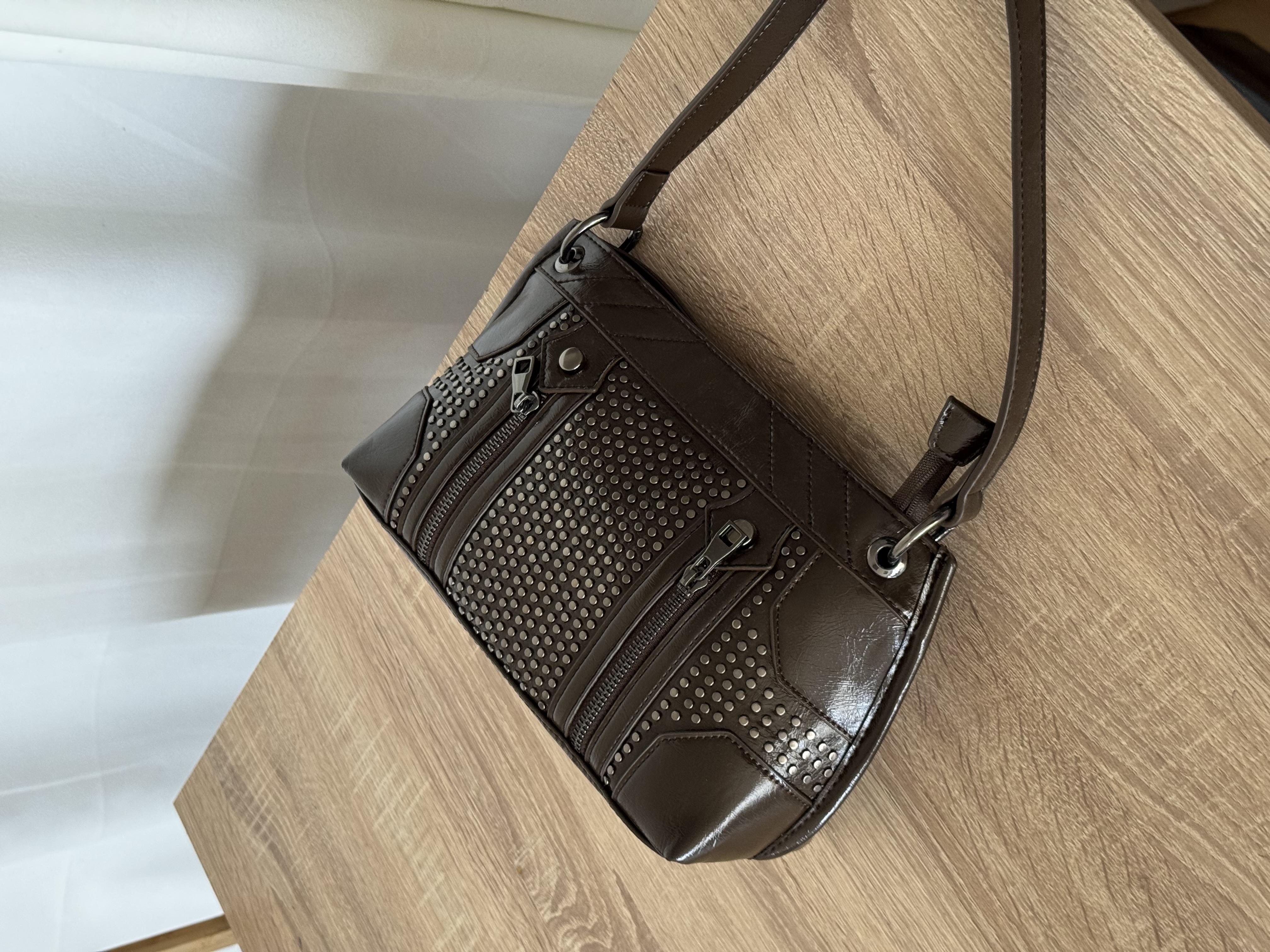 Silk shoulder bag with studs in olive brown
