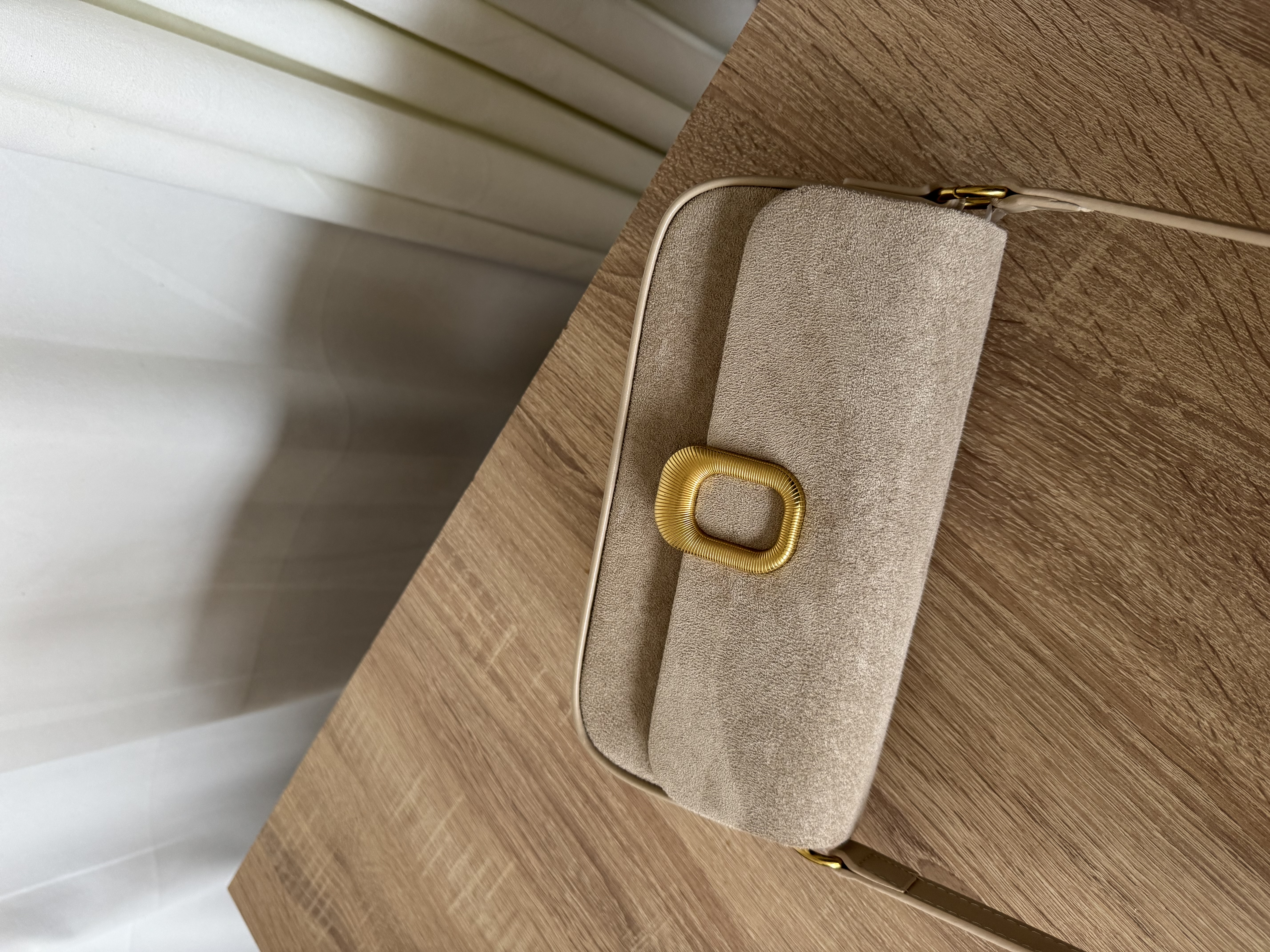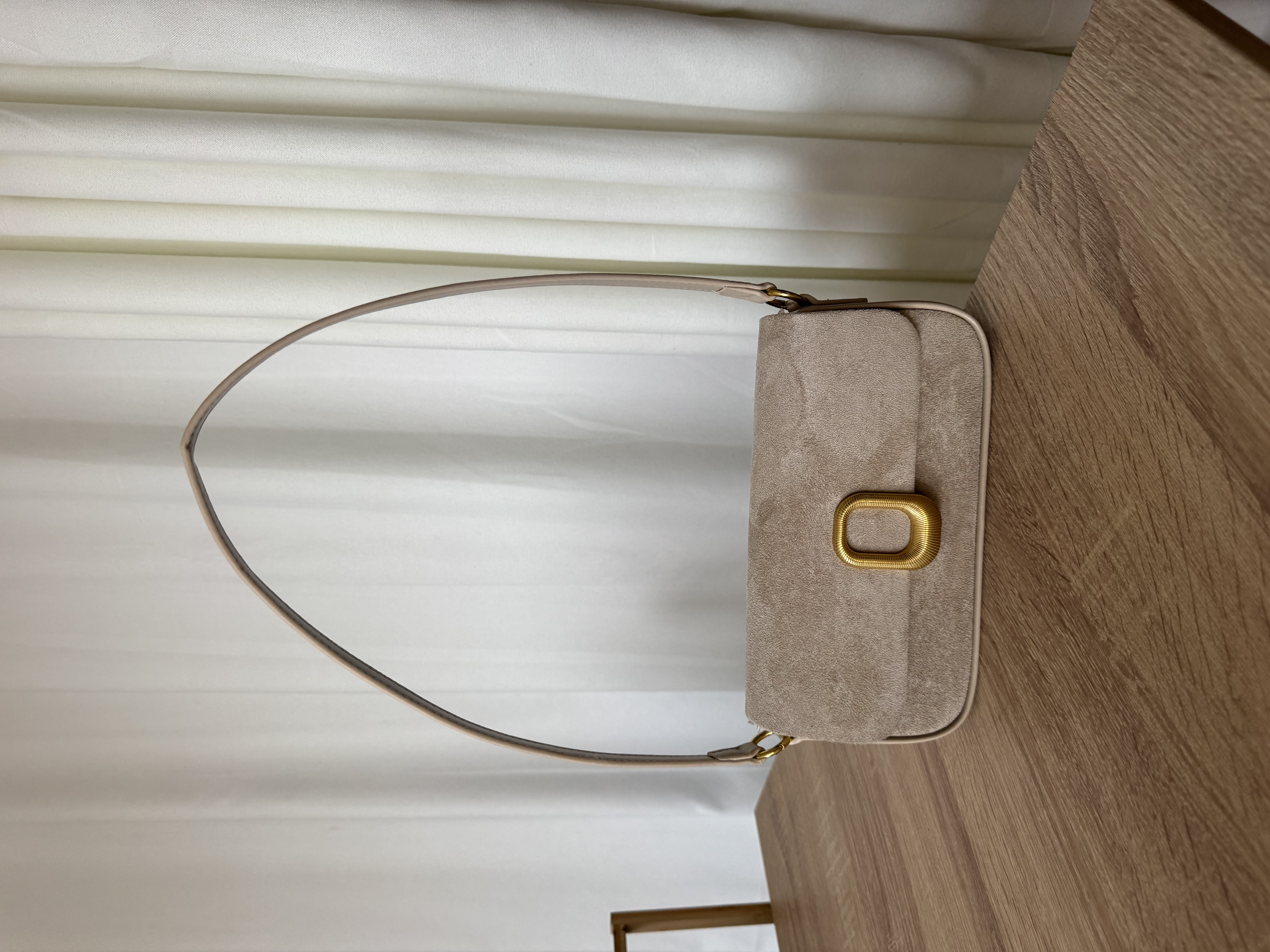 Vegan Suede shoulder bag with gold detail in almond