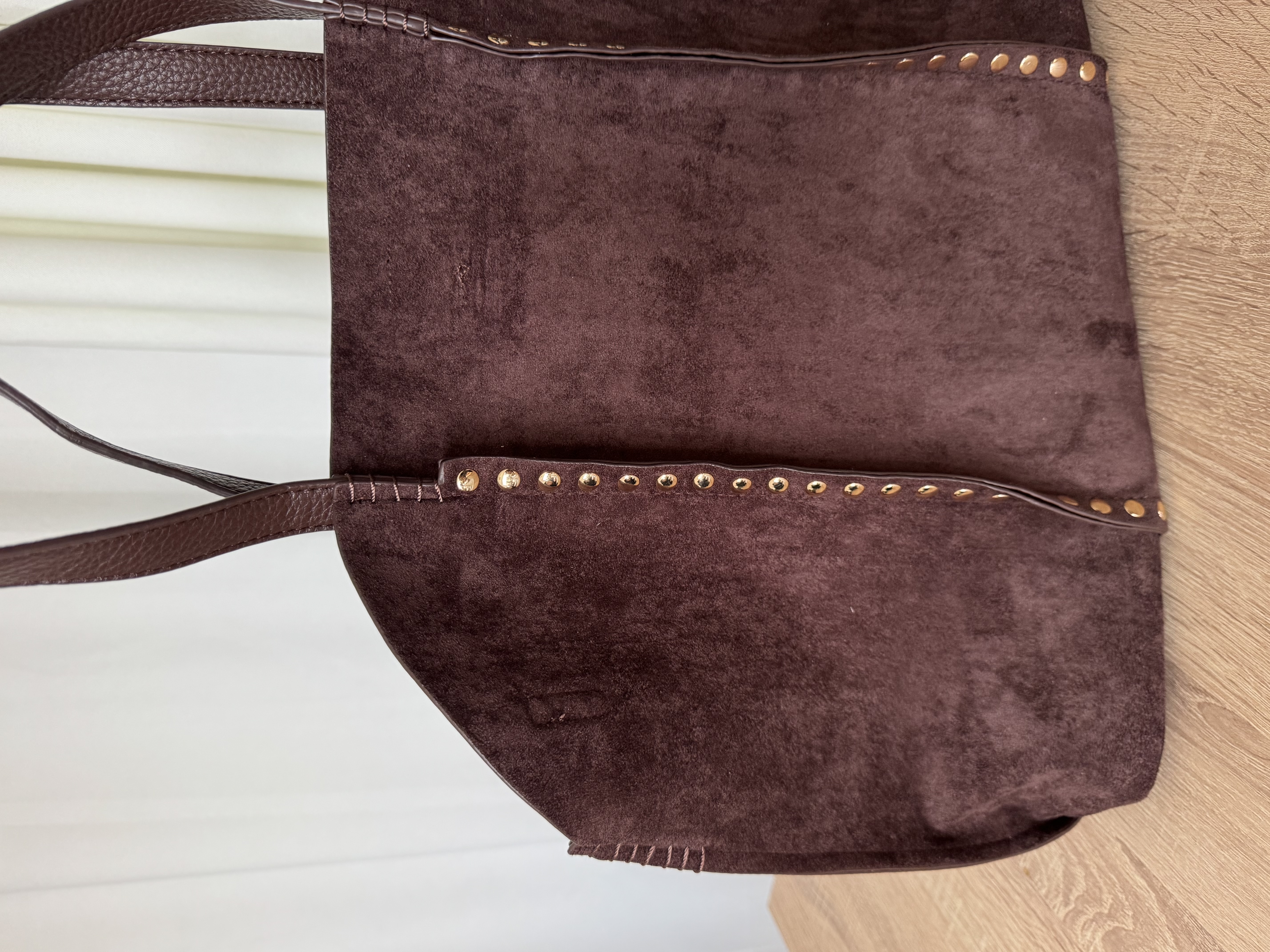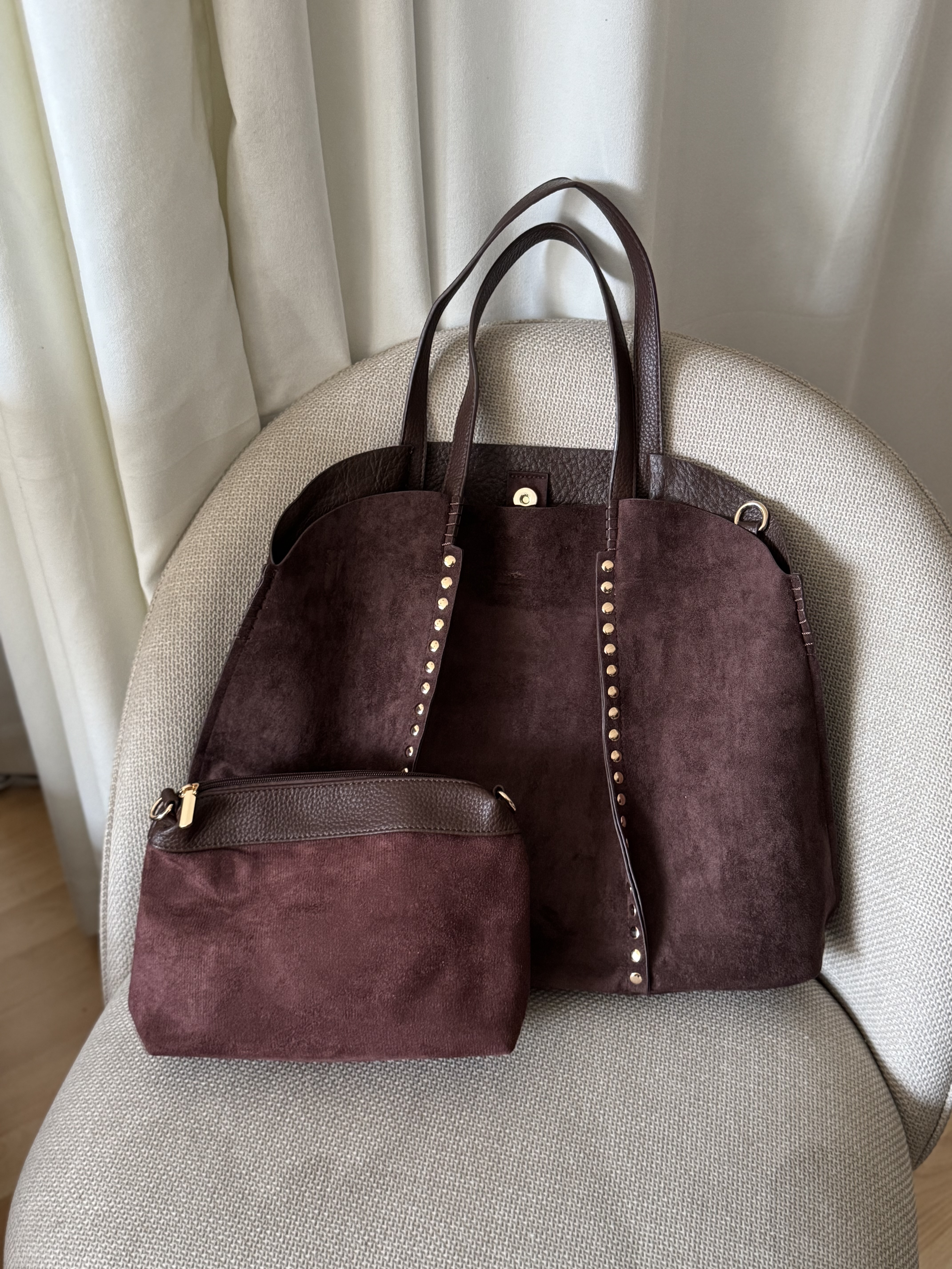 Large vegan suede bag with studs in coffee