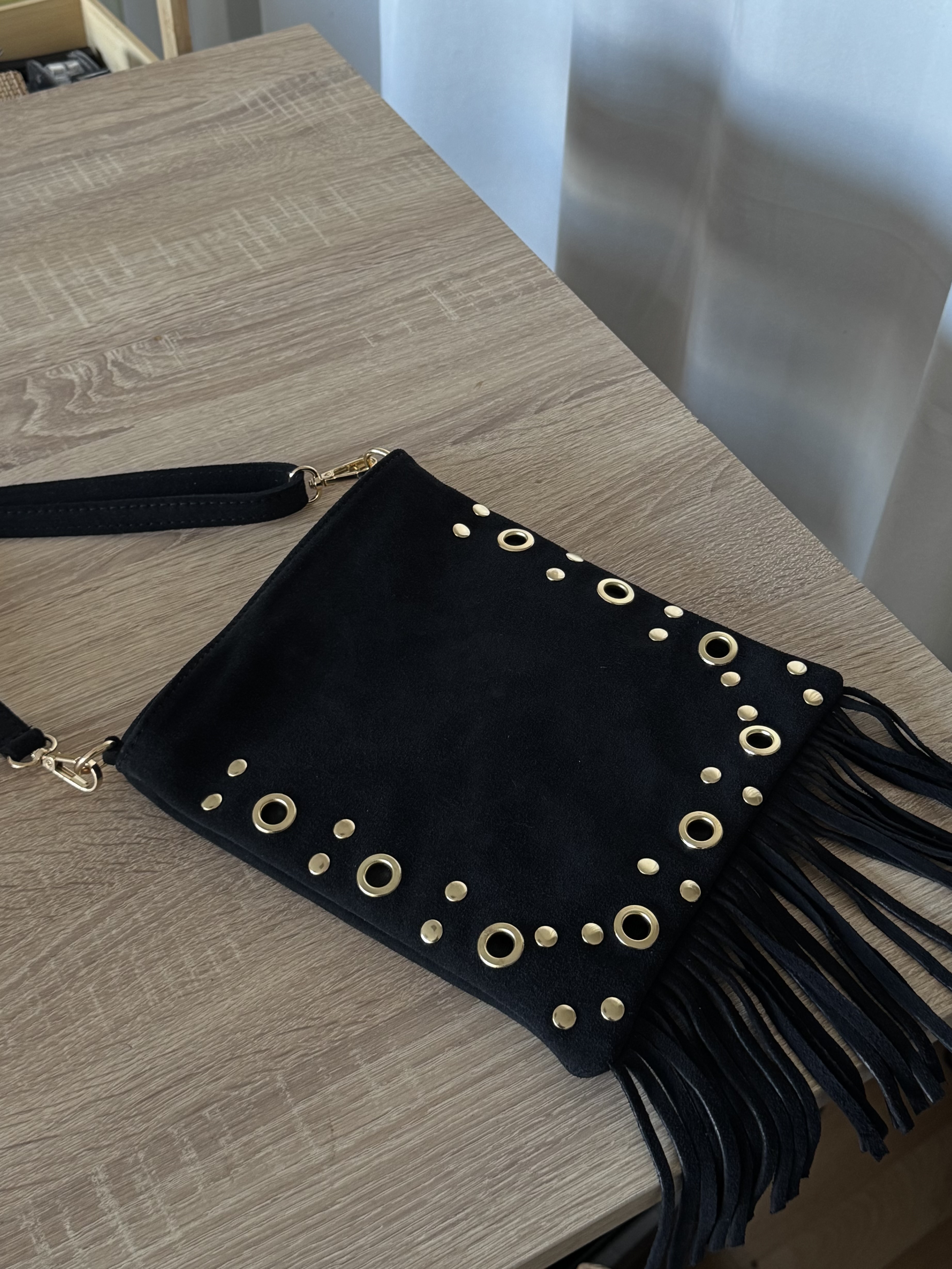 Suede crossbody bag with fringes and studs