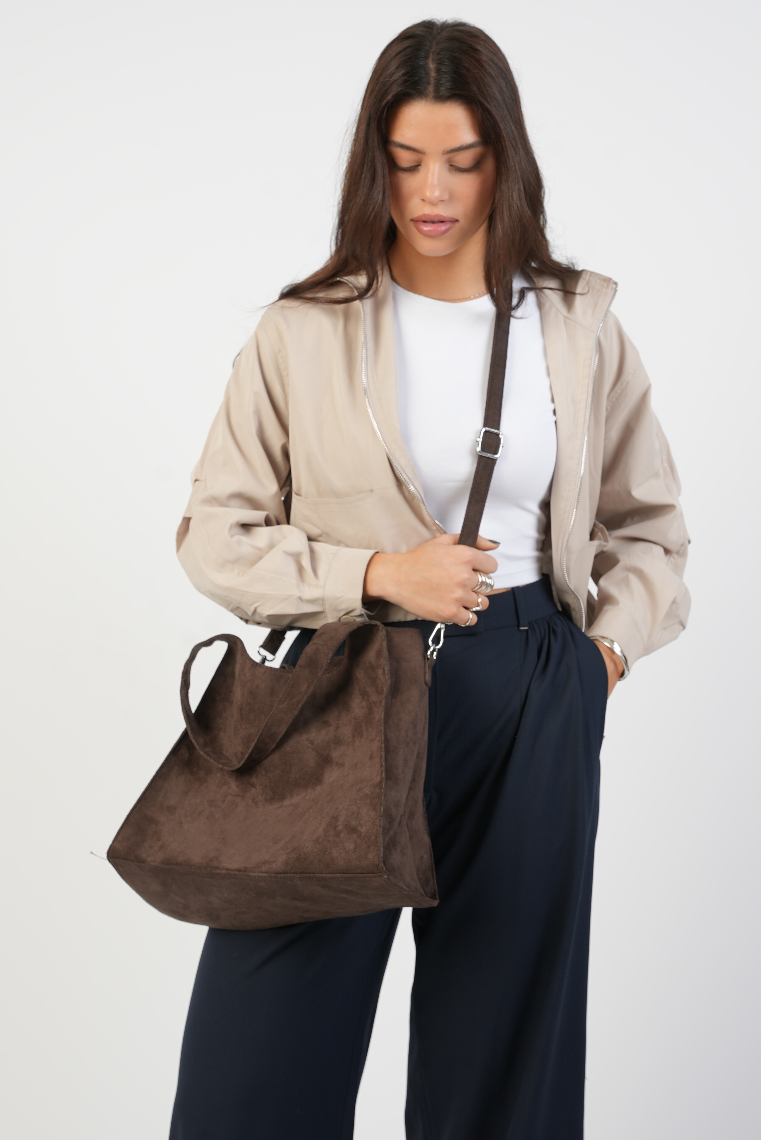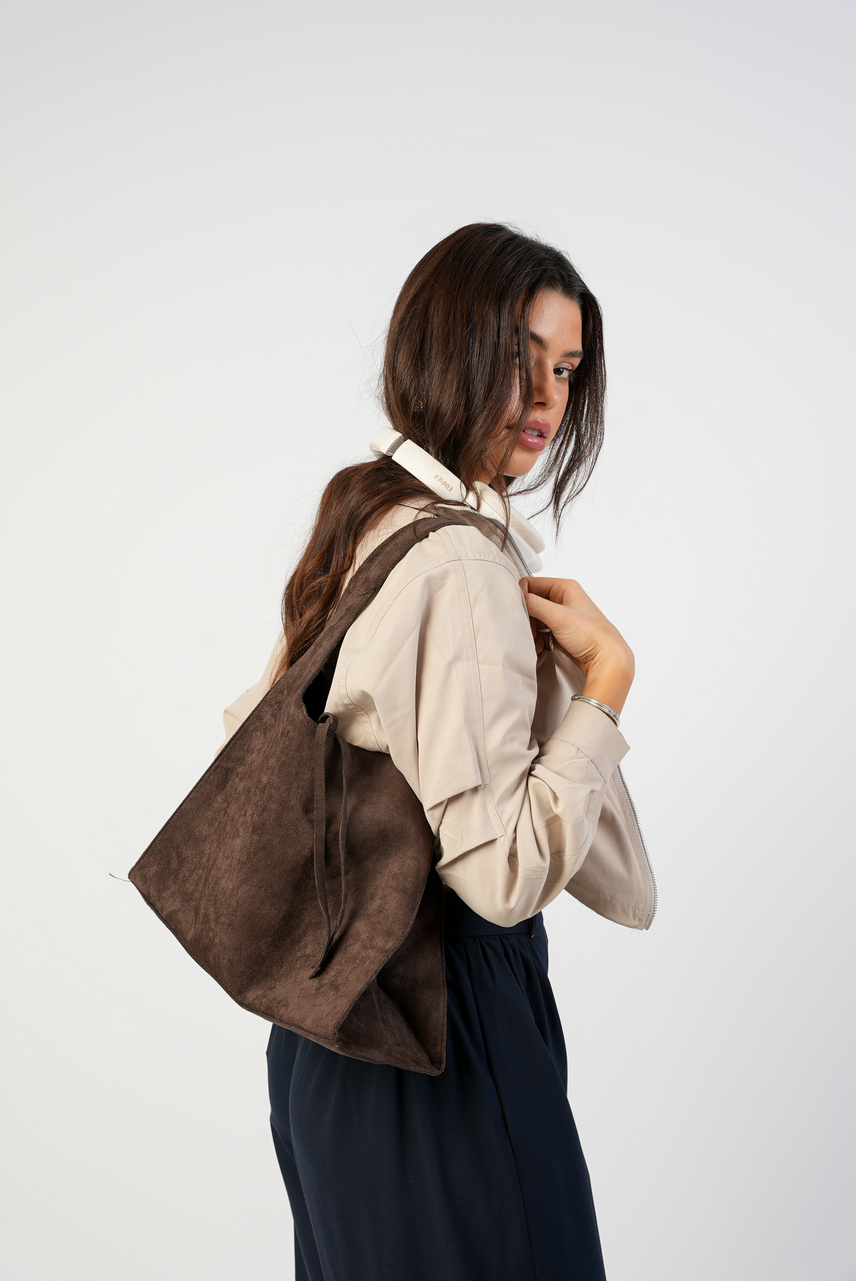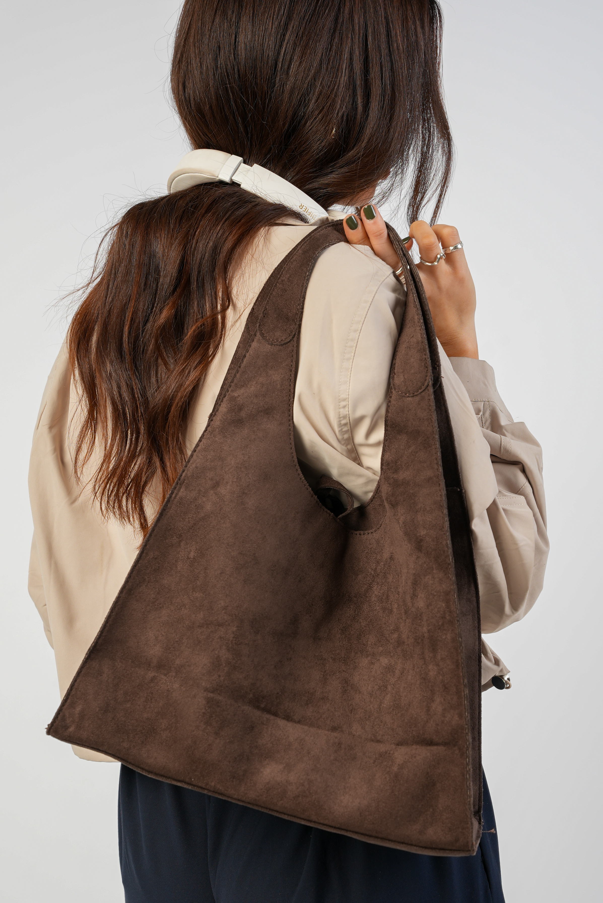Vegan Suede Shoulder bag with zipper and strap in coffee