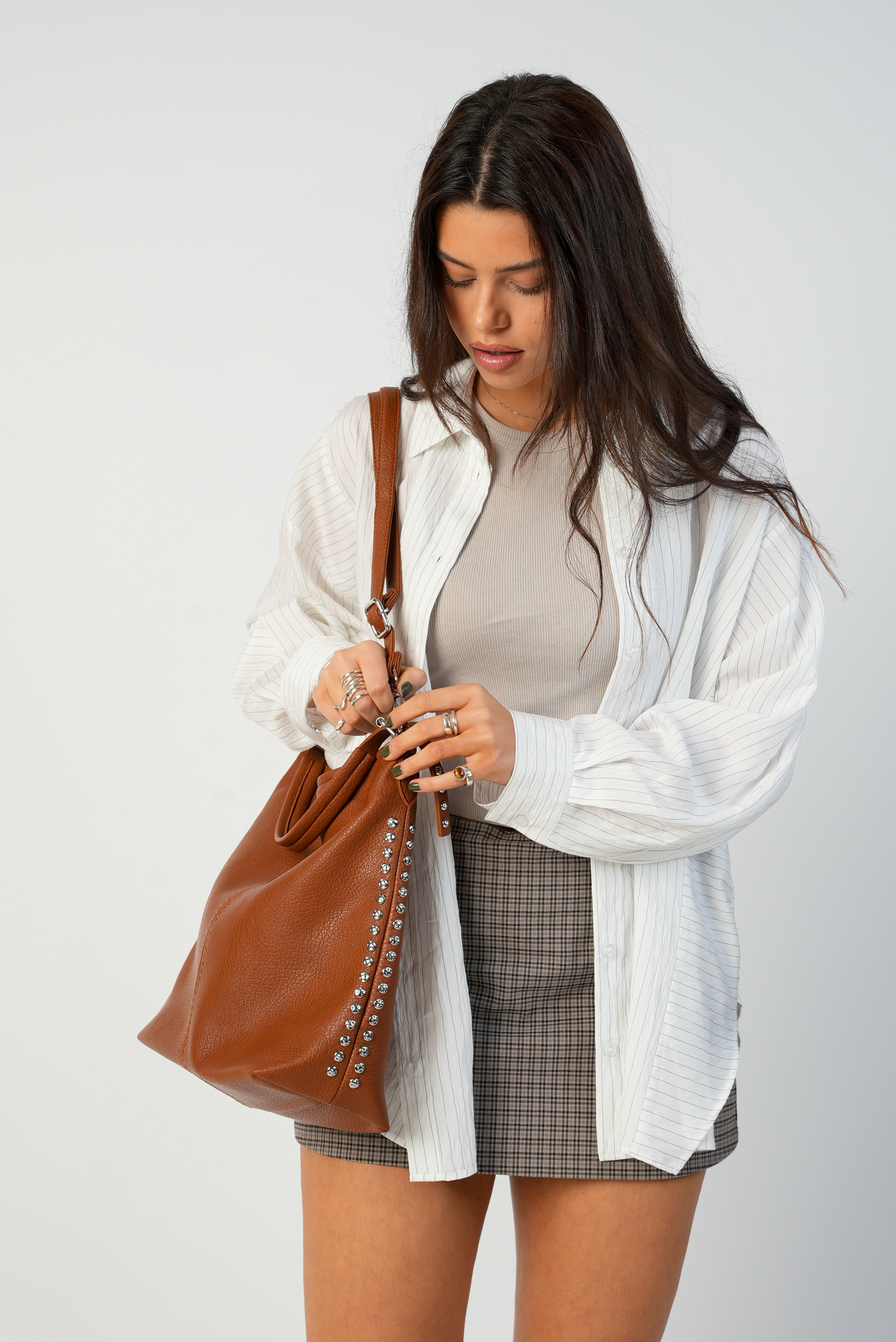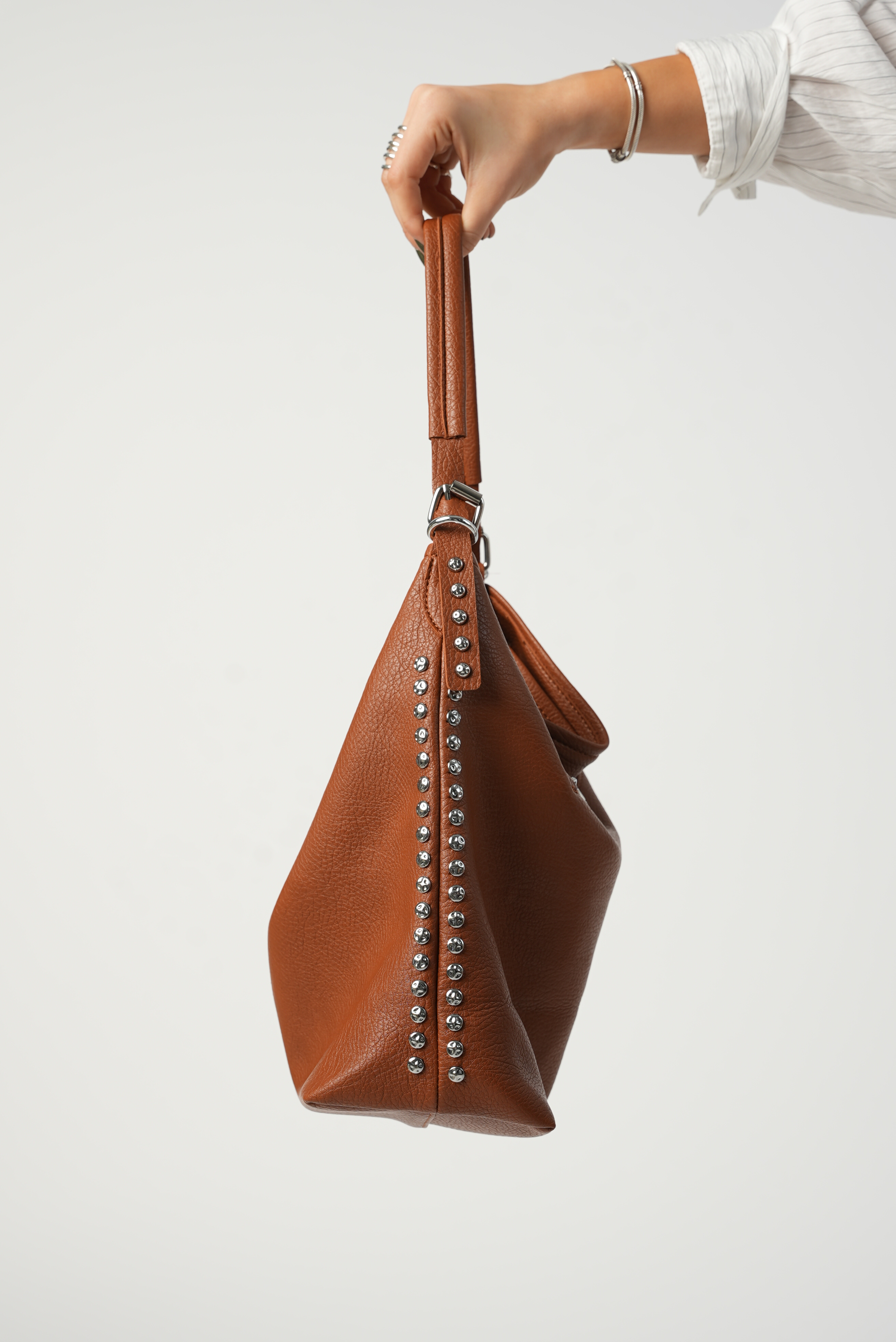 Vegan bucket bag with studs in brown