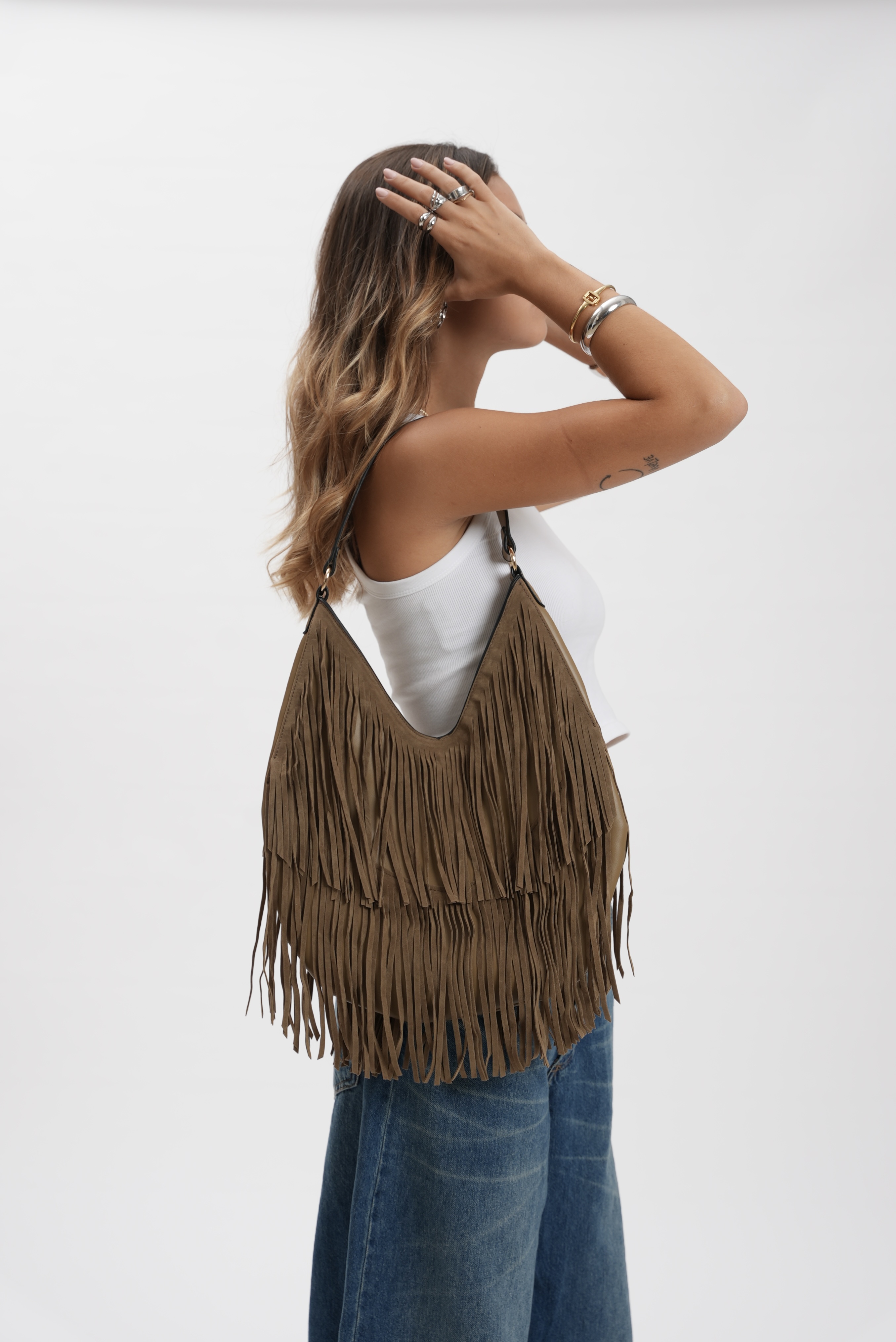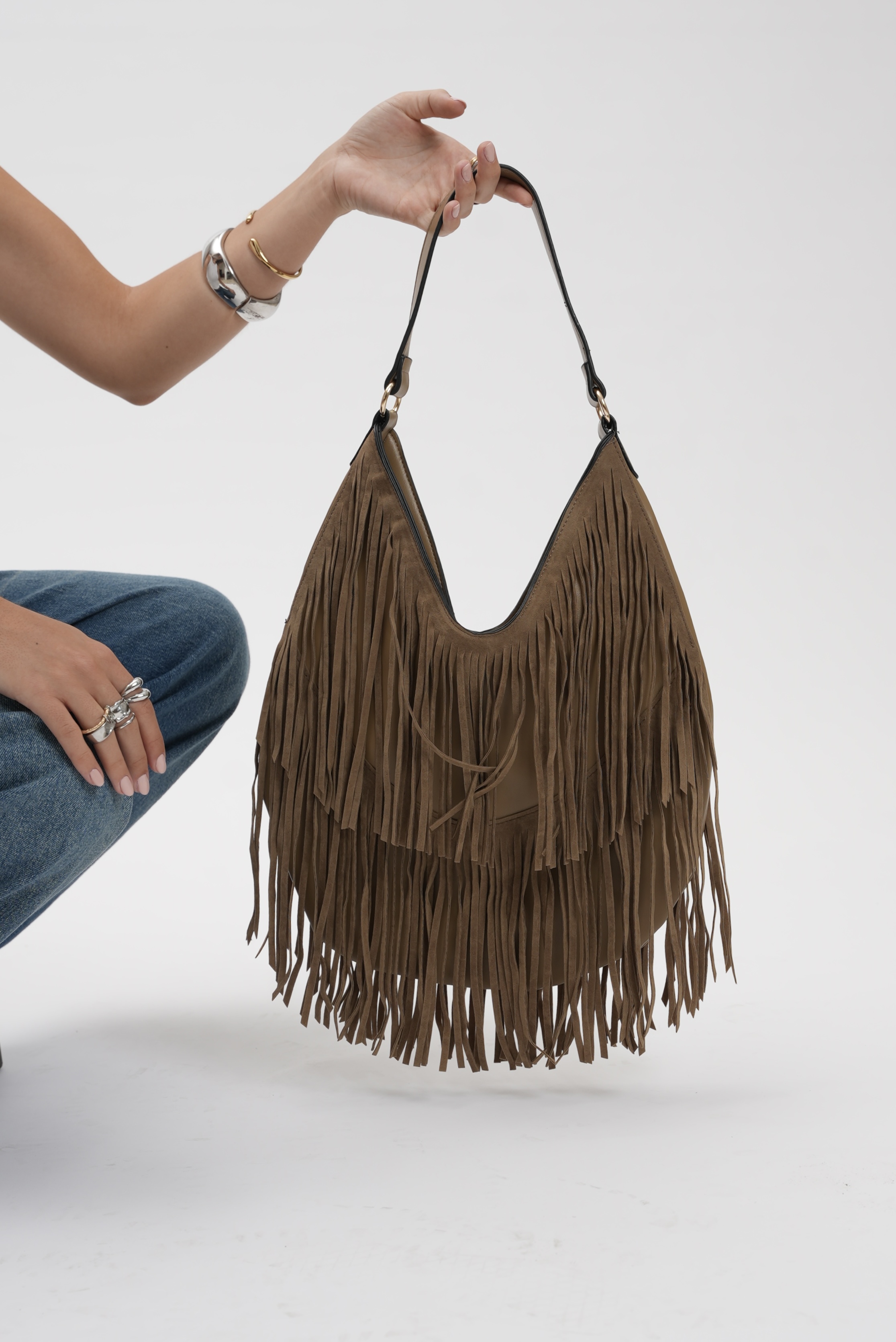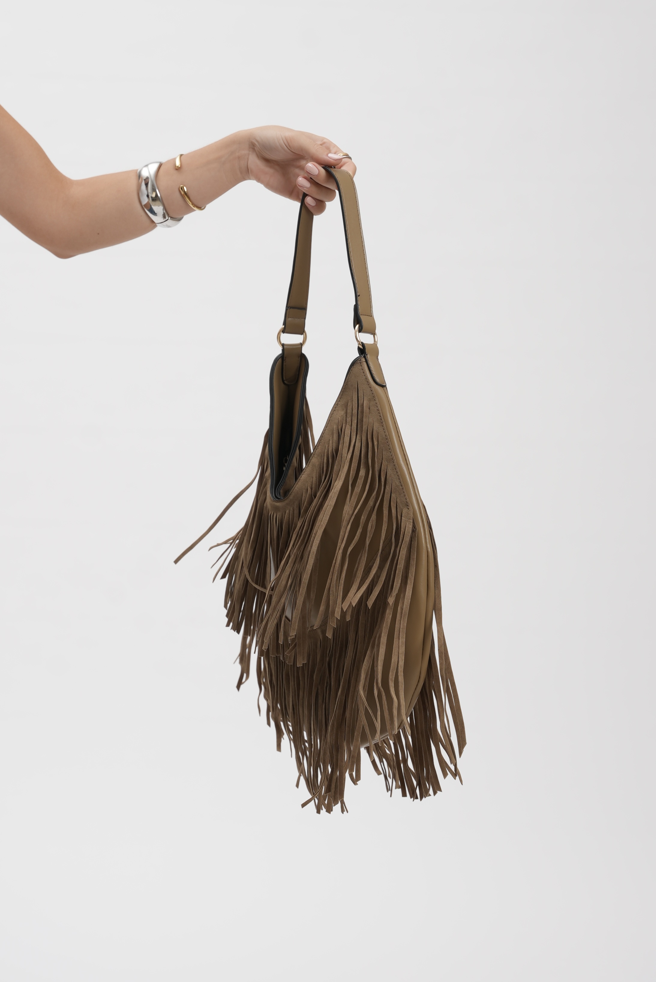 Saddle bag with fringes in taupe