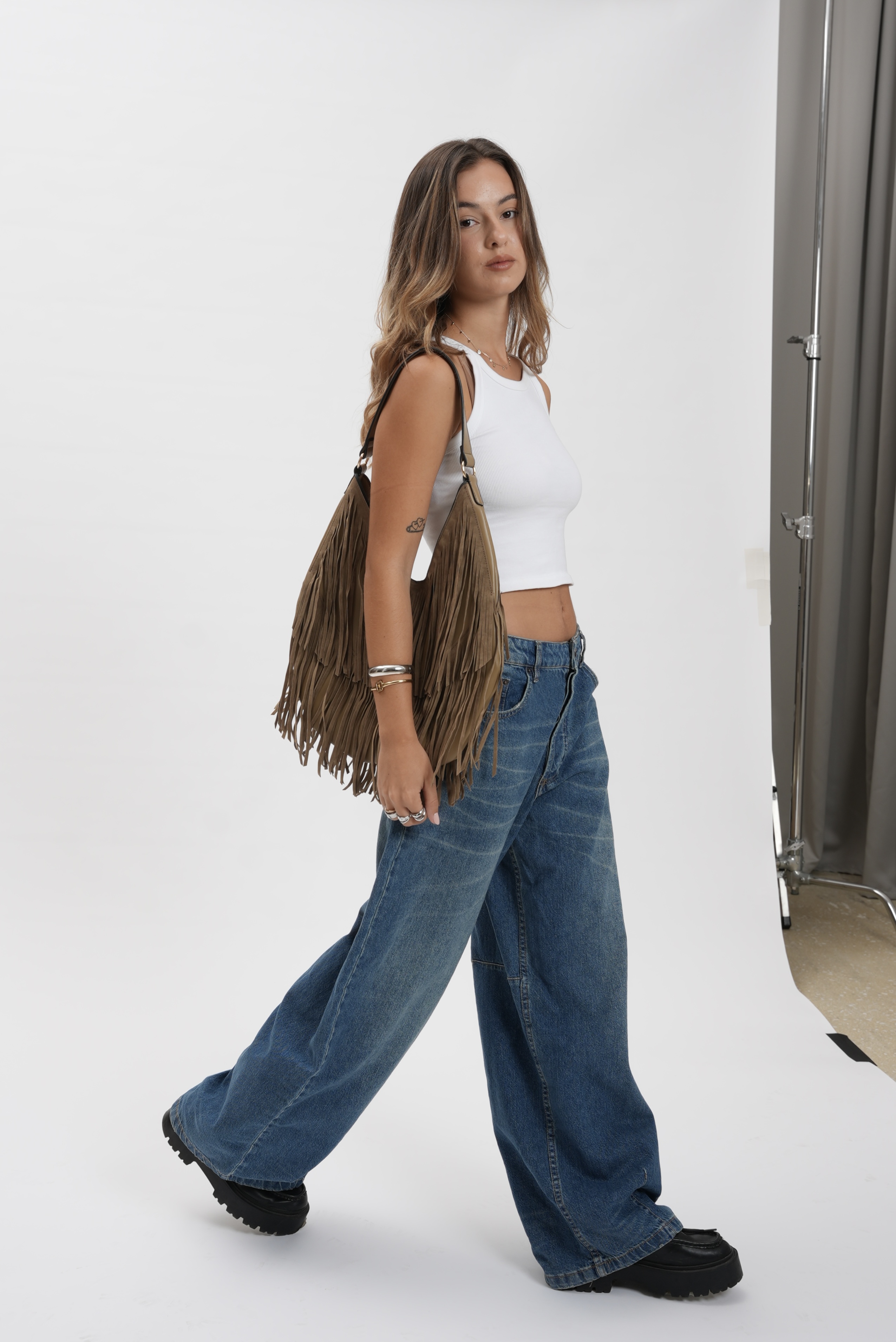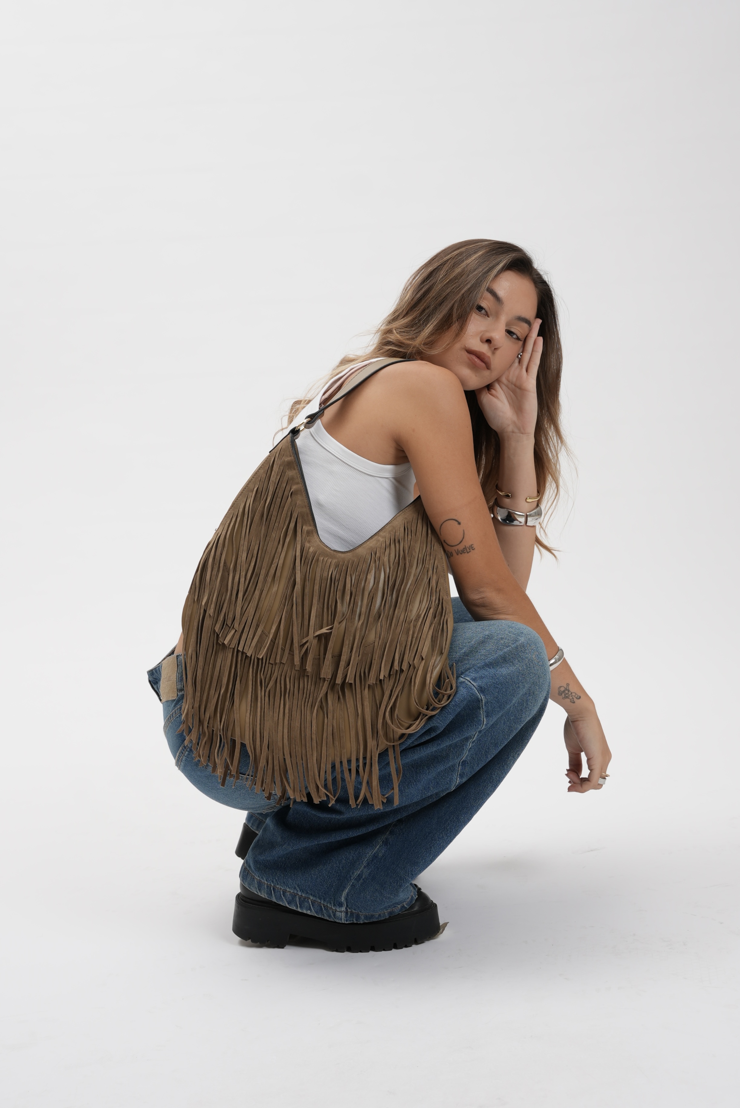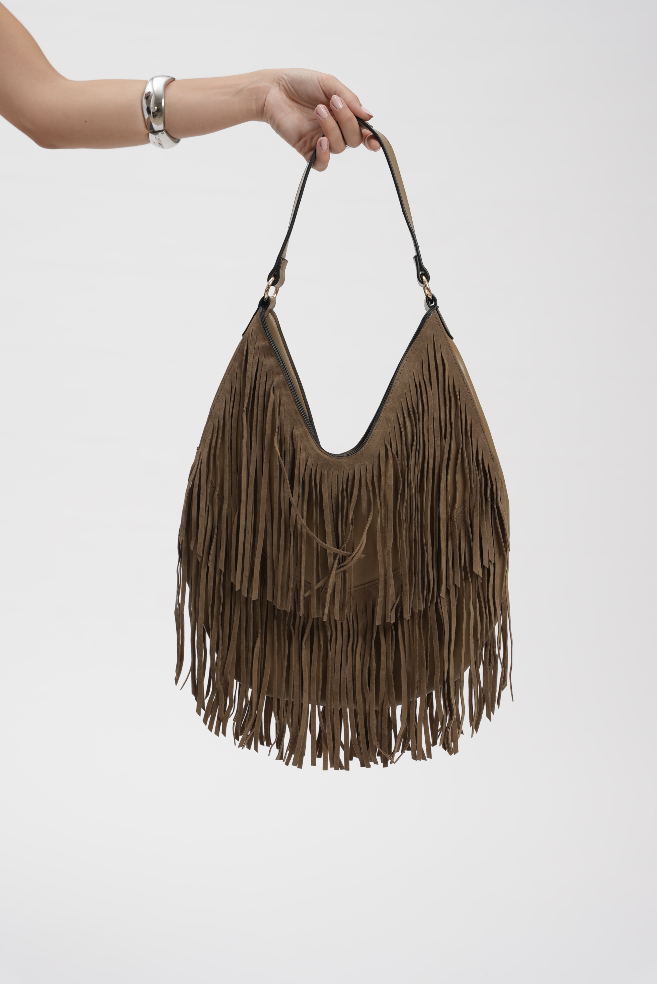 Saddle bag with fringes in taupe