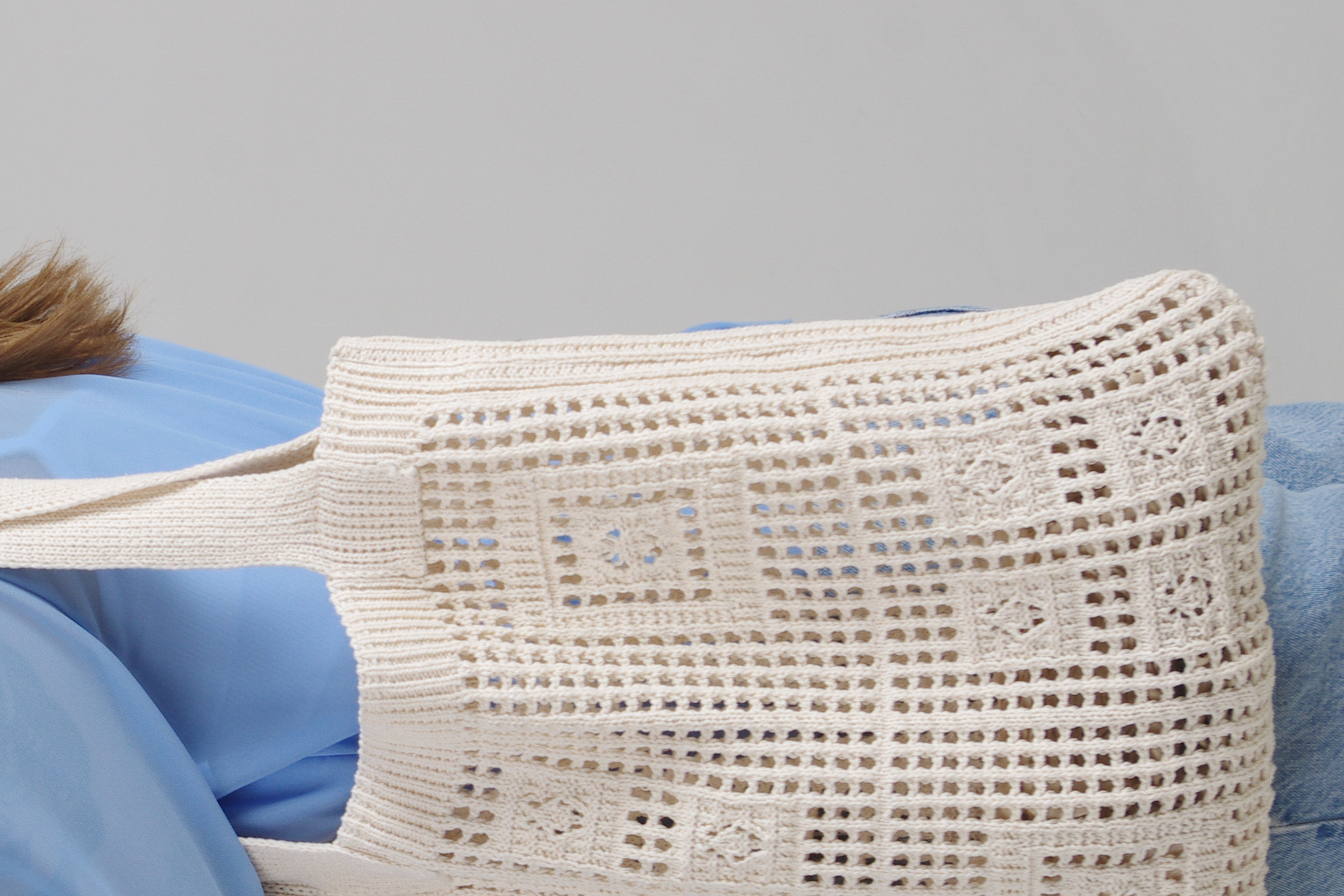 Crochet tote bag in ivory with knitted patterns