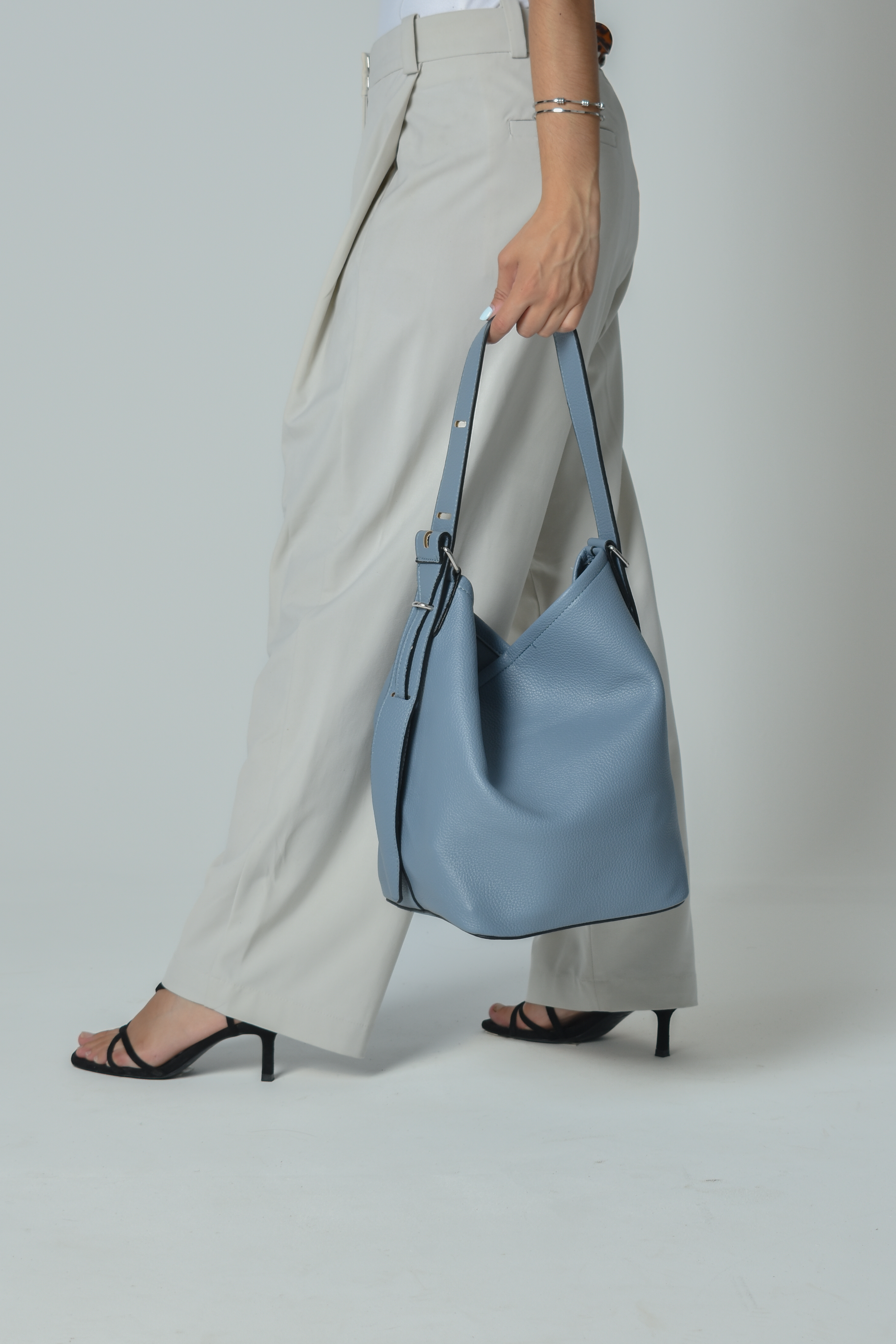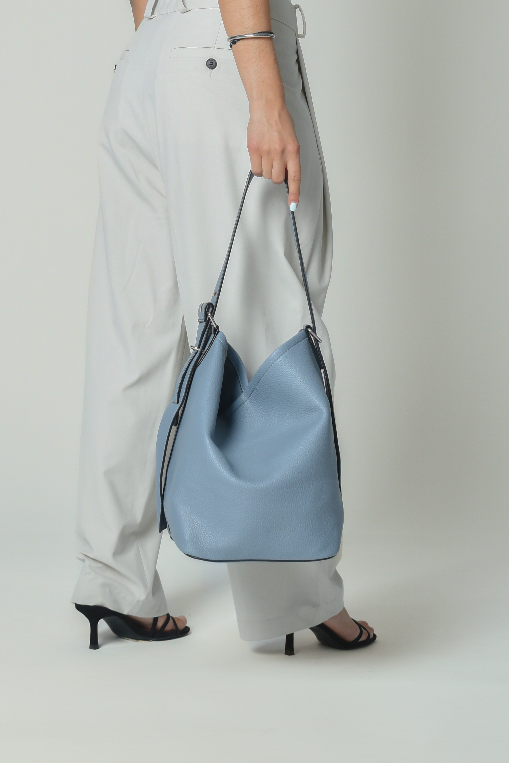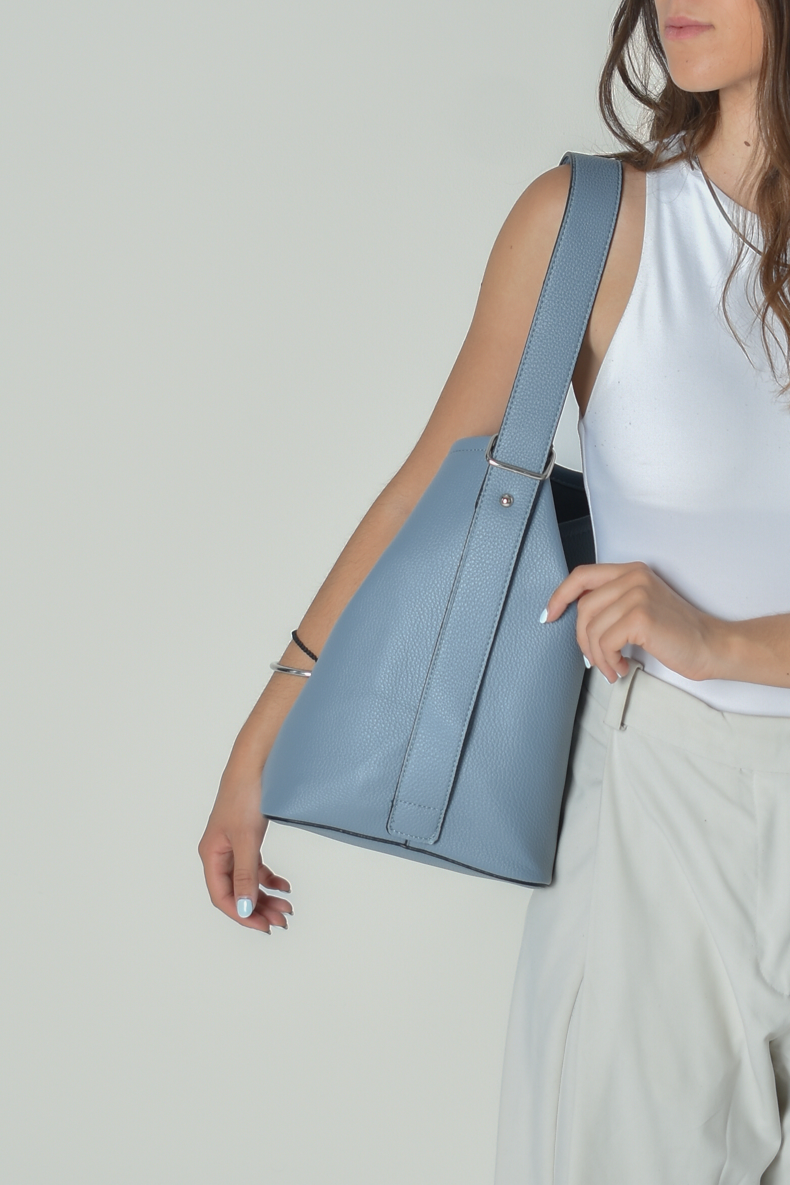 Bucket bag with metalic details in ciel