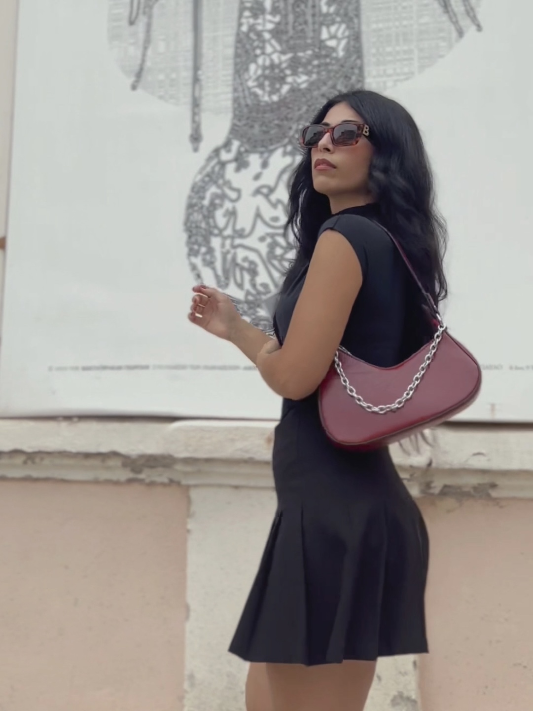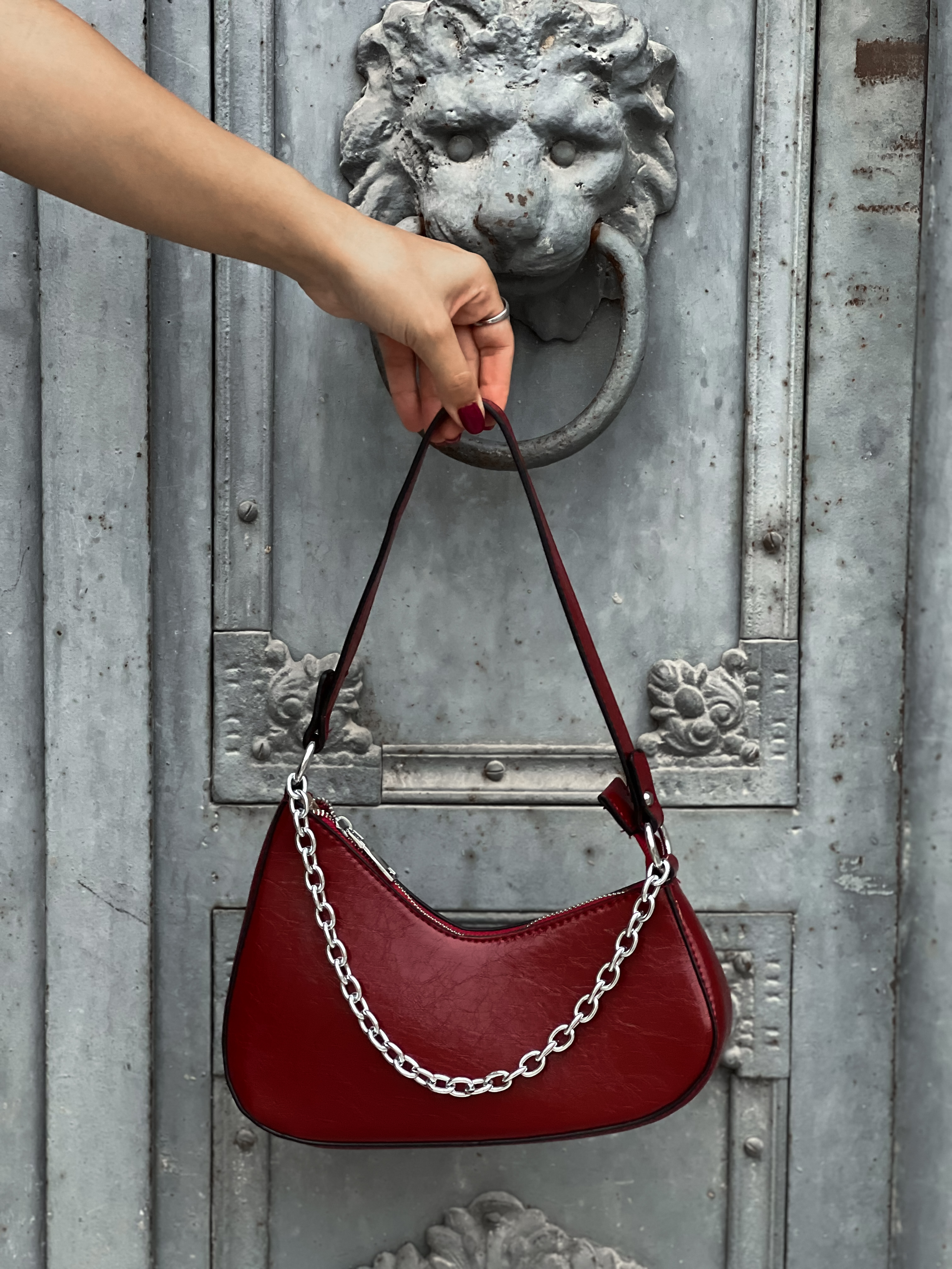 Silk shoulder bag with chain in wine red